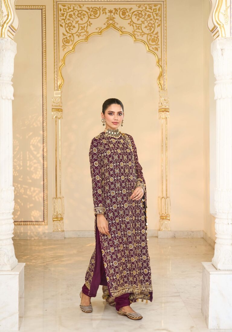 The long kurta is designed in a rich maroon bandhani pattern crafted from premium fabric that offers structure and elegance. It features detailed handwork arranged with balance to elevate the garment’s visual depth while maintaining a graceful overall silhouette.