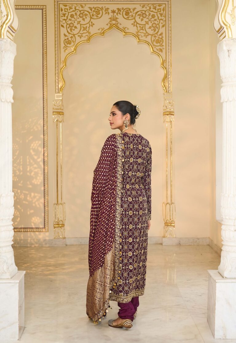 A refined maroon bandhani kurta set featuring hand embroidery, paired with a matching churidar and an elegantly bordered dupatta for a complete festive and wedding-ready look.