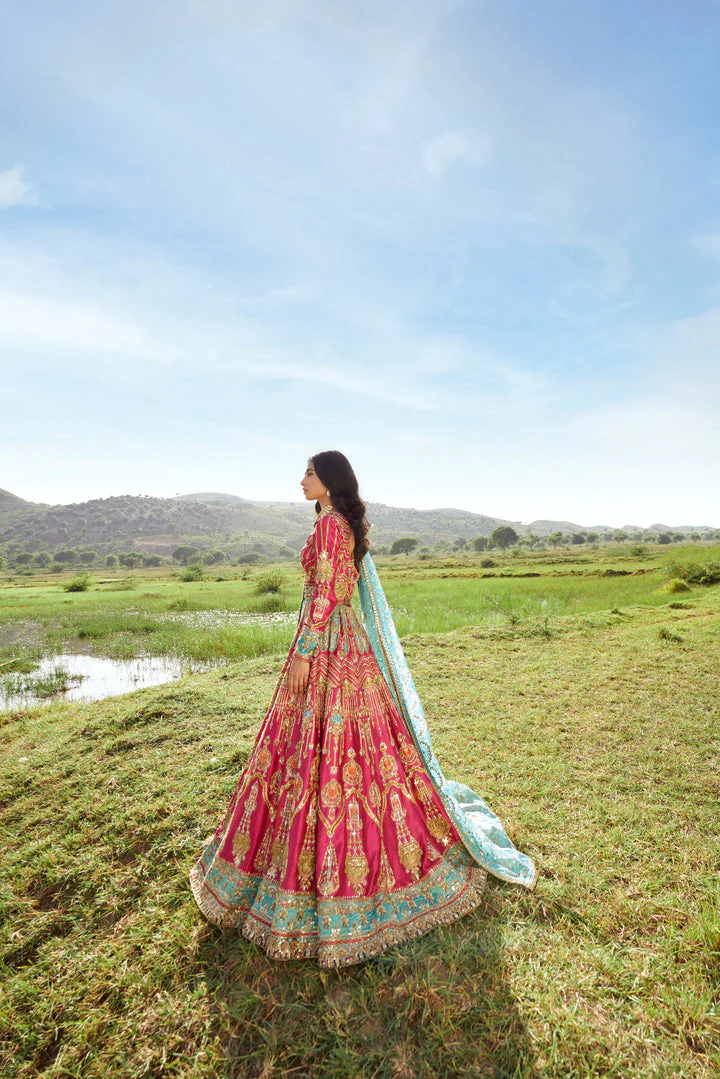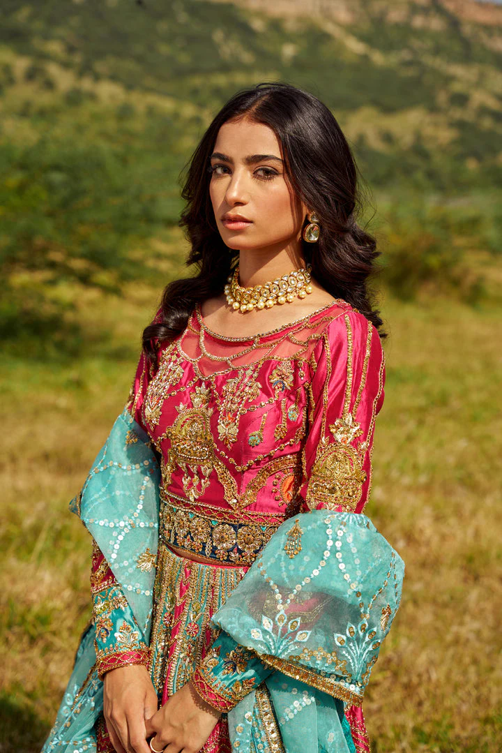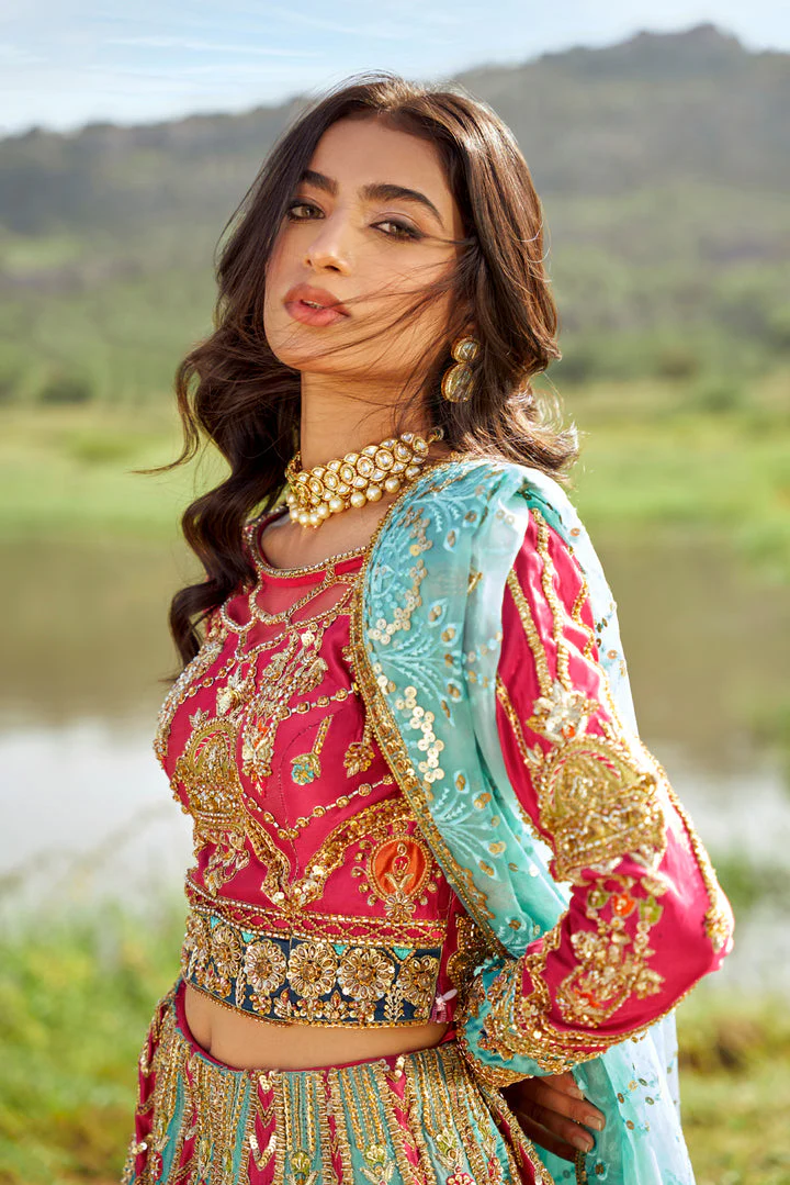 The hot pink choli is crafted from premium silk and beautifully adorned with intricate embroidery, shimmering goldwork, sequins, and crystals. Hand-crafted embellishments elevate the elegance, making it a perfect choice for the bride on her special day.