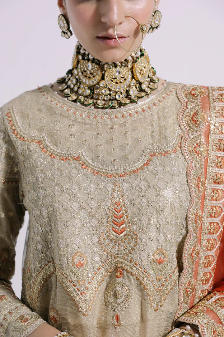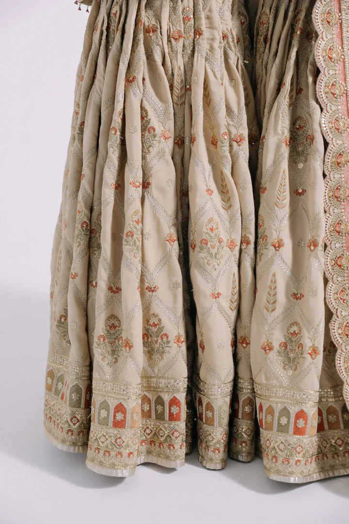 Intricate embroidery including pearls, cut dana, dori, gota chevrons, and floral chatta, carefully crafted to create a rich and regal traditional bridal appearance.