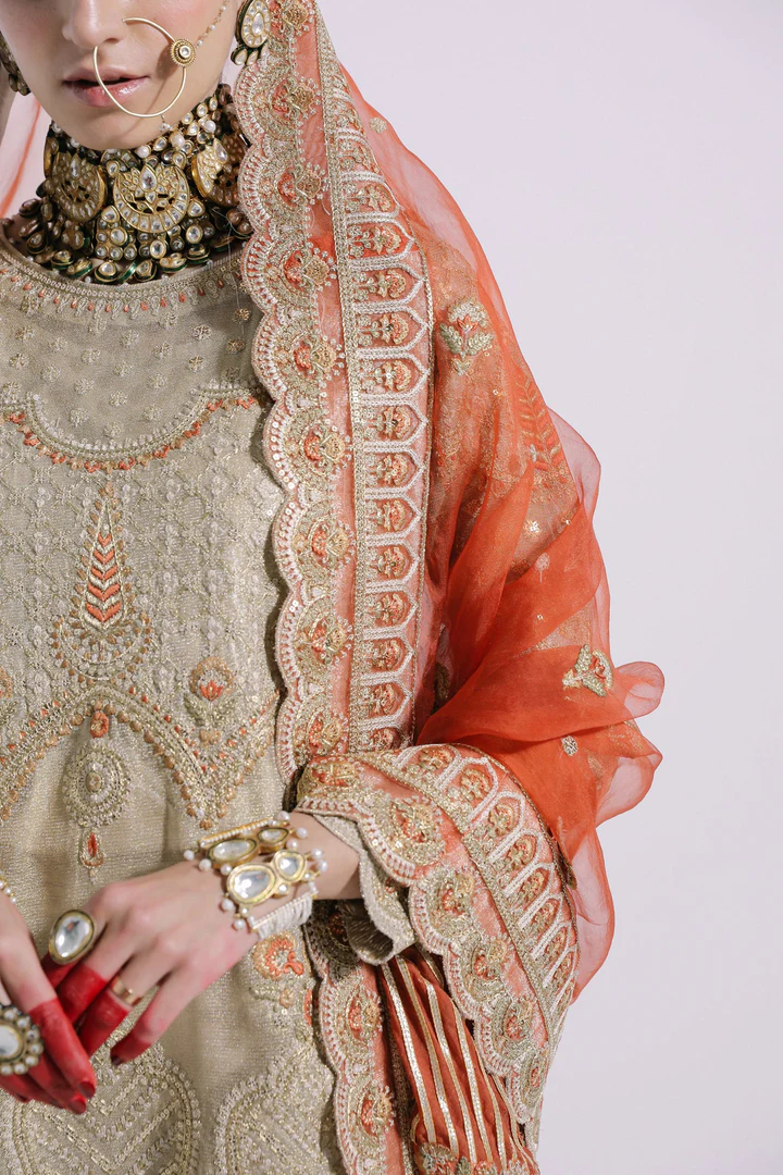 The rust organza dupatta completes the ensemble with a heavily embroidered scalloped border on all sides. Pallu sections feature gota chevrons and floral chatta embroidery spread across the net, adding richness and elegance. The flowing dupatta enhances the traditional silhouette, perfect for a bride who desires a statement-making, culturally inspired look.