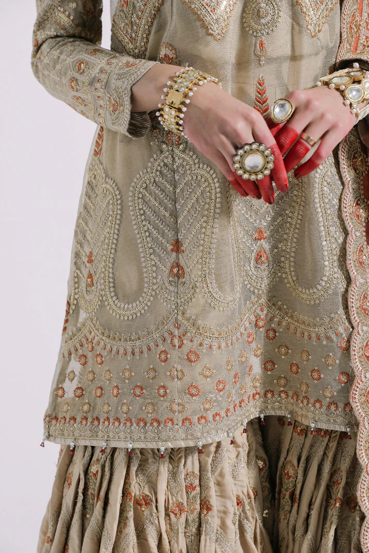 The sharara is made from raw silk synthetic fabric in a stone tone and features a wide flare for a dramatic, traditional look. The hem is adorned with an exquisite embroidered border and tatami fillings in complementary rust, green, and brown hues. Symmetrical patterns throughout create a harmonious eastern aesthetic, completed with golden zari binding at the hem, making it a standout piece for bridal wear.