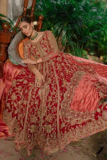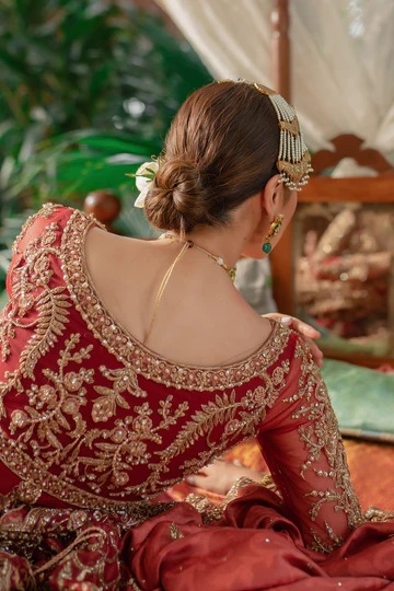 The top is designed in a rich scarlet palette infused with subtle burnt rust and muted pink undertones to create a layered, regal effect. Crafted from premium fabric, it features an intricate arrangement of hand-applied embellishment that brings depth and dimension to the surface. Wild garden–inspired motifs are interpreted through delicate detailing, capturing a refined yet majestic aesthetic suitable for high-end ceremonial wear.