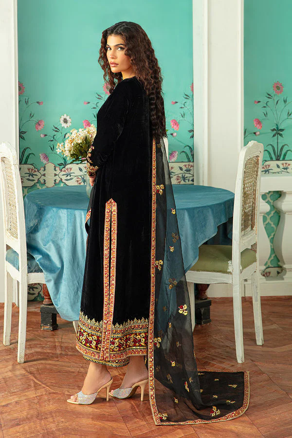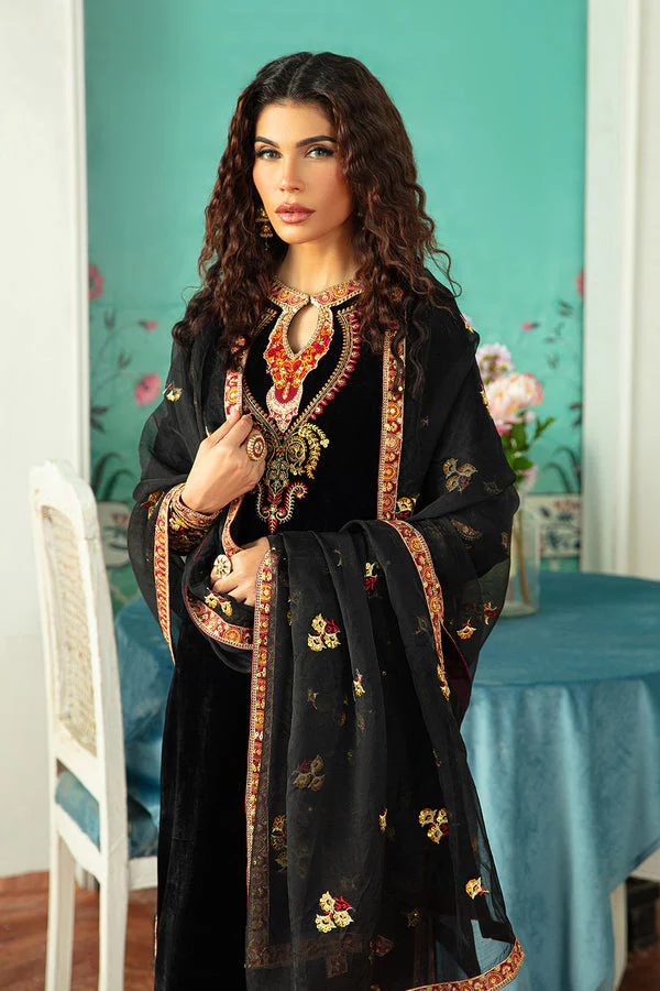 Silk velvet for kameez, gharara/salwar, and dupatta with intricate embroidery work.