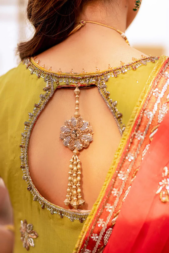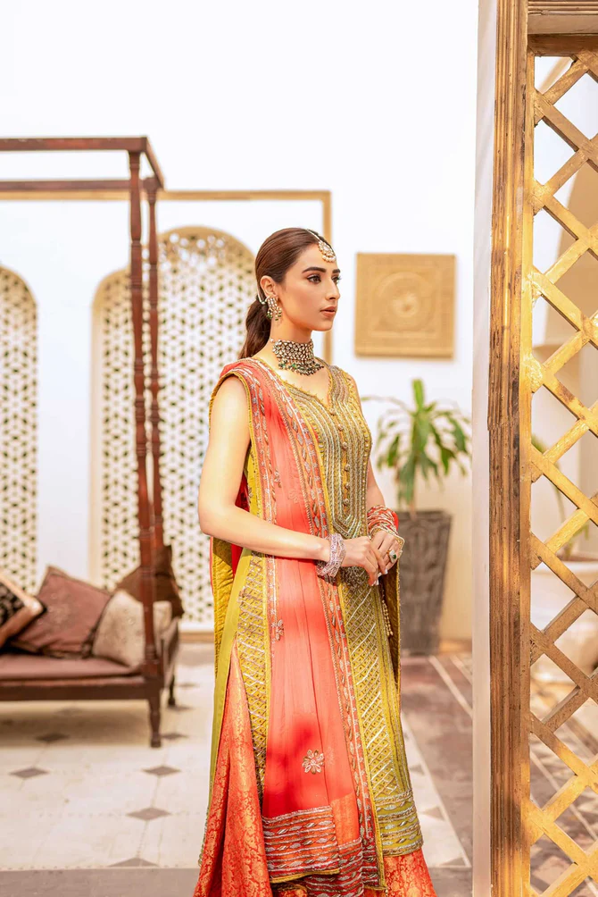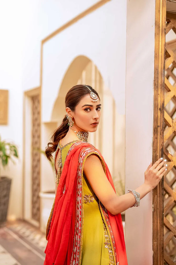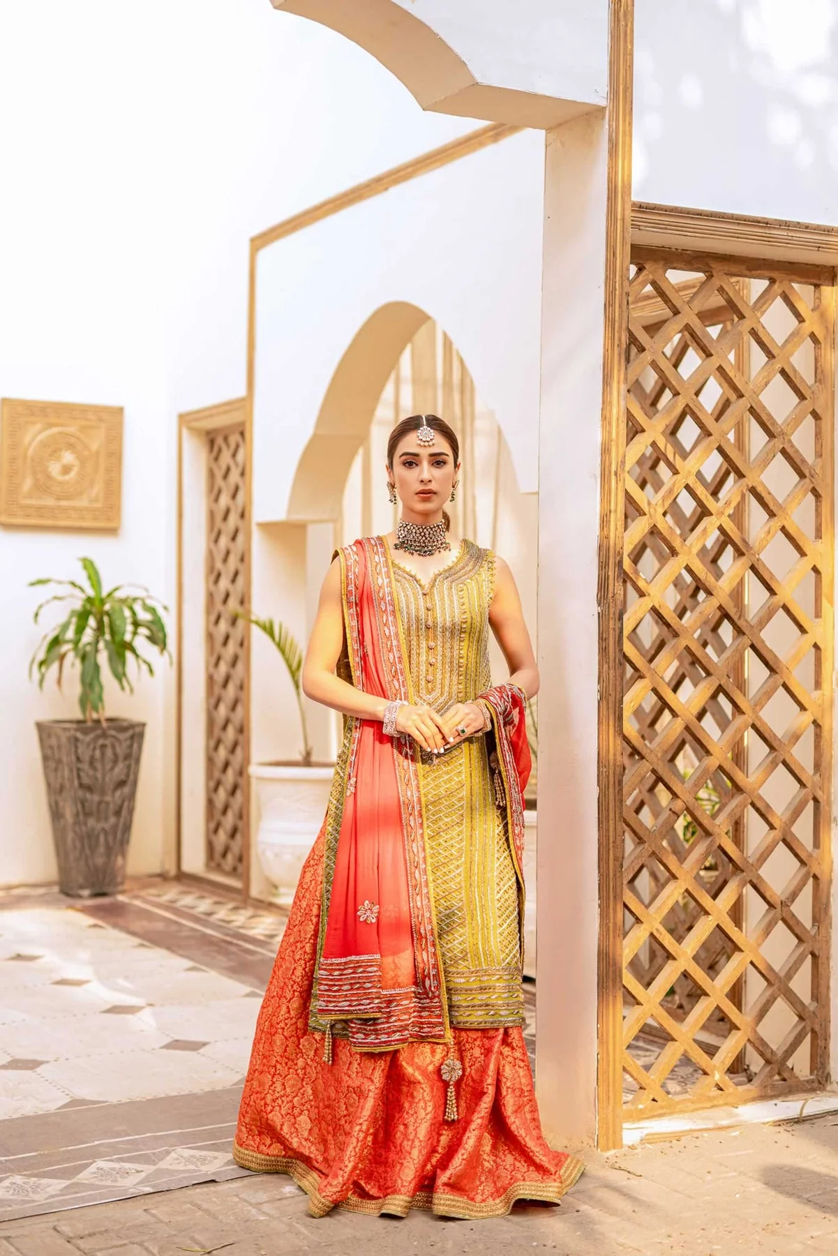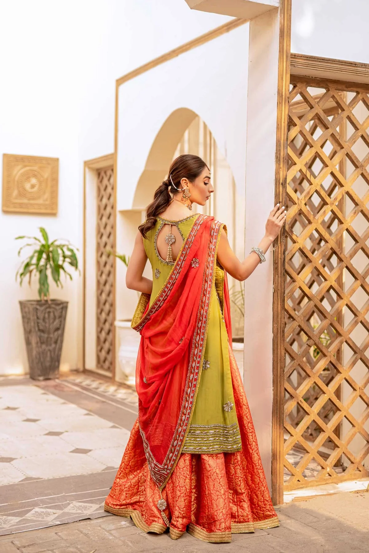 The ensemble is completed with a vibrant tangerine dupatta, beautifully adorned with embroidery and mukesh work. The delicate embellishments on the dupatta harmonize with the kameez and lehenga, adding the final touch of refinement and grandeur to the Mehndi outfit.