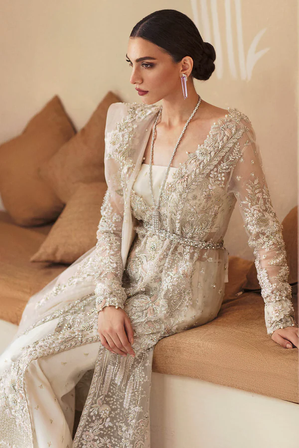 This glamoured bridal creation is crafted as an organza paneled long shirt, designed to flow with effortless elegance. The entire canvas is adorned with soft pink floral 3D embellishments and katdana work, further glorified with shimmering sequined pearls and crystals. Each detail is thoughtfully placed to revive bridal beauty with a graceful balance of romance and modern sophistication.