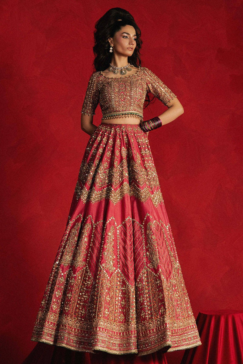 Indian silk is used for the choli and lehenga, paired with fine organza for the dupatta to ensure balance between richness and lightness.