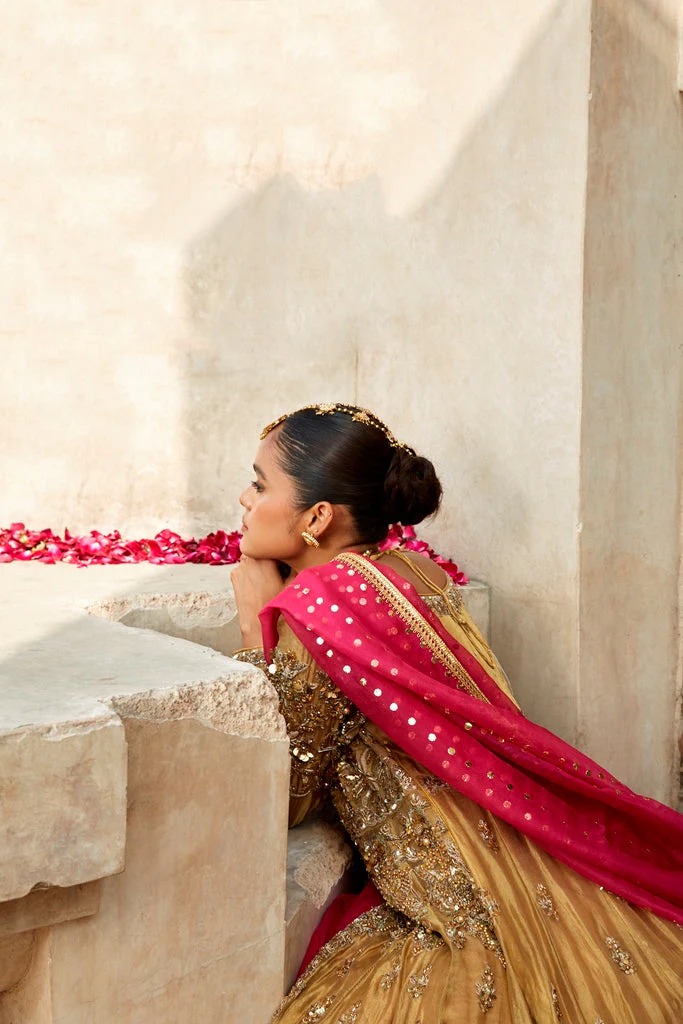 The outfit is elevated with a beautifully detailed jacket designed in a luminous golden tone. Artistic embellishment is carefully applied across the jacket, adding richness and visual depth. The structured design creates a striking contrast against the soft pink base, bringing a luxurious finish to the overall look.