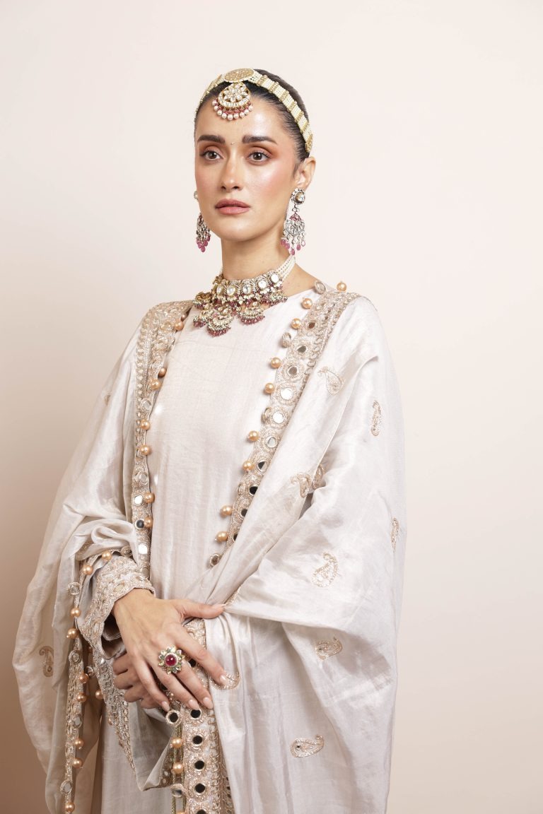 The dupatta completes the outfit with its airy drape and hand-embellished accents that mirror the kurta’s artistry. A carefully finished border frames the piece, adding a subtle touch of elegance while keeping the look cohesive and polished.