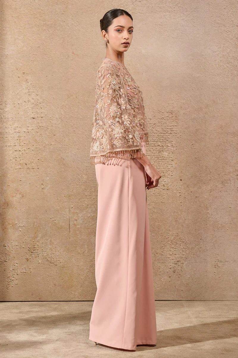 Inner bodice and palazzo trousers made from premium crepe-silk blend; outer cape crafted from fine embellished net with a soft satin finish on the inner seams.