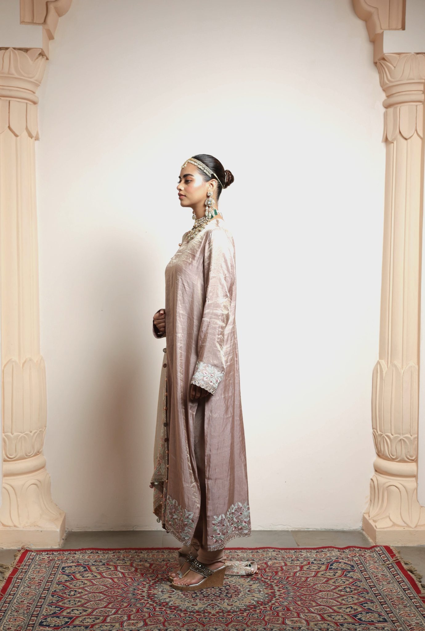 The long kurta is designed in a soft old-rose tone and crafted from a premium fabric that offers a smooth drape and structured elegance. Intricate multicolored thread artistry, cutdana detailing, and reflective accents are arranged thoughtfully to create a rich, handcrafted surface. The silhouette retains a classic charm while providing a graceful modern appeal.