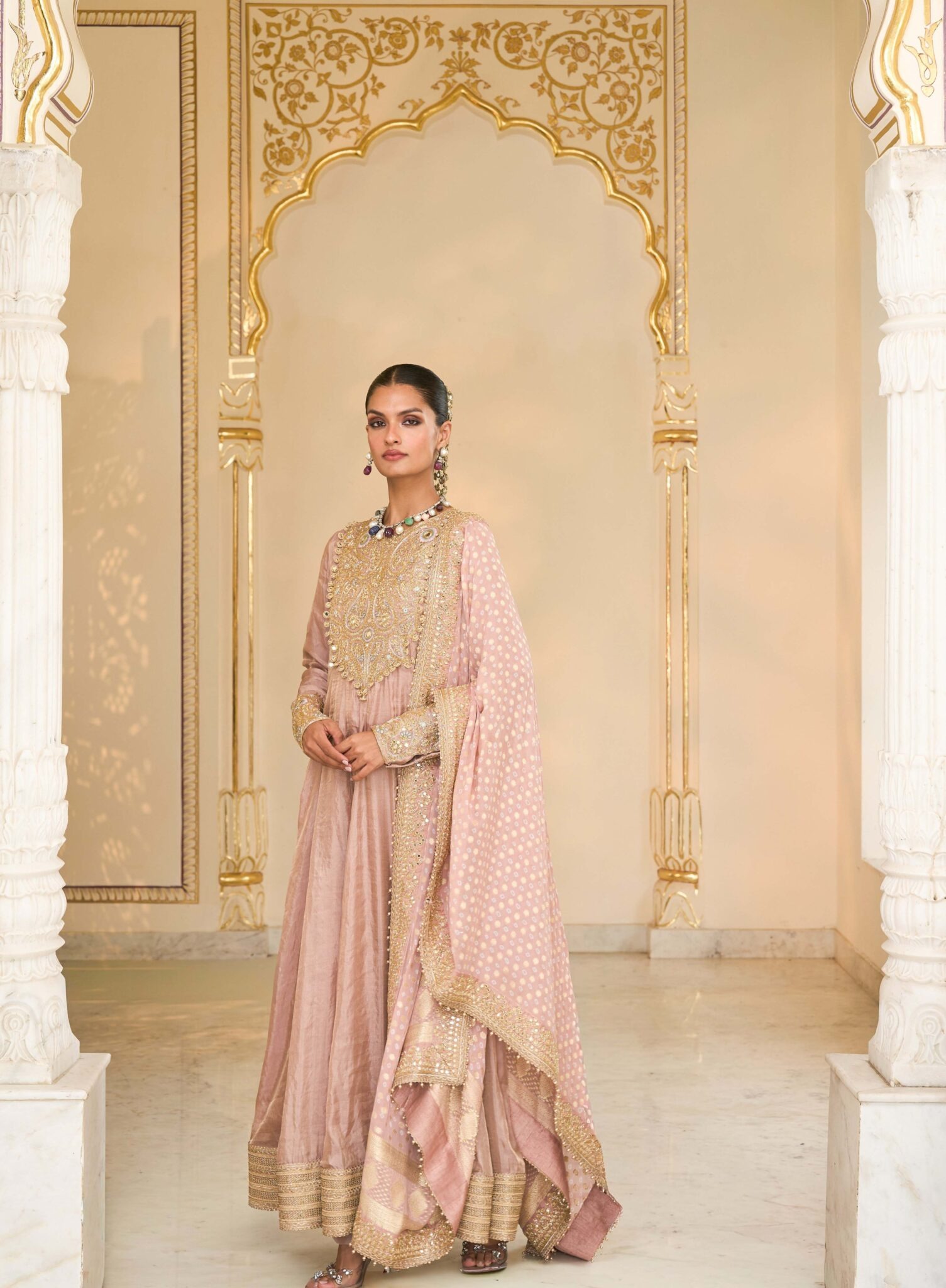 A delicately crafted anarkali set in soft rose tones, featuring refined handwork, a sleek churidar, and a beautifully detailed bandhani dupatta for an elegant festive or wedding look.