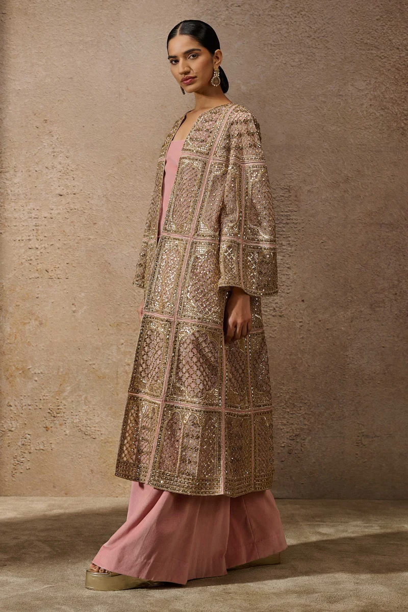 The top consists of a dual-layered structure, featuring a sleek, sleeveless inner bodice crafted from premium rosewood velvet with a clean square neckline. Over this sits an exquisite long-line coat designed with an open front and mid-length sleeves. The coat is fashioned from a delicate mesh, entirely covered in a structured grid of golden tilla and threadwork. Each panel of the coat features intricate geometric patterns and shimmering sequin fills, creating a luminous contrast against the matte velvet inner. The sleeves are finished with a flared cuff, mirroring the ornate detailing of the bodice.