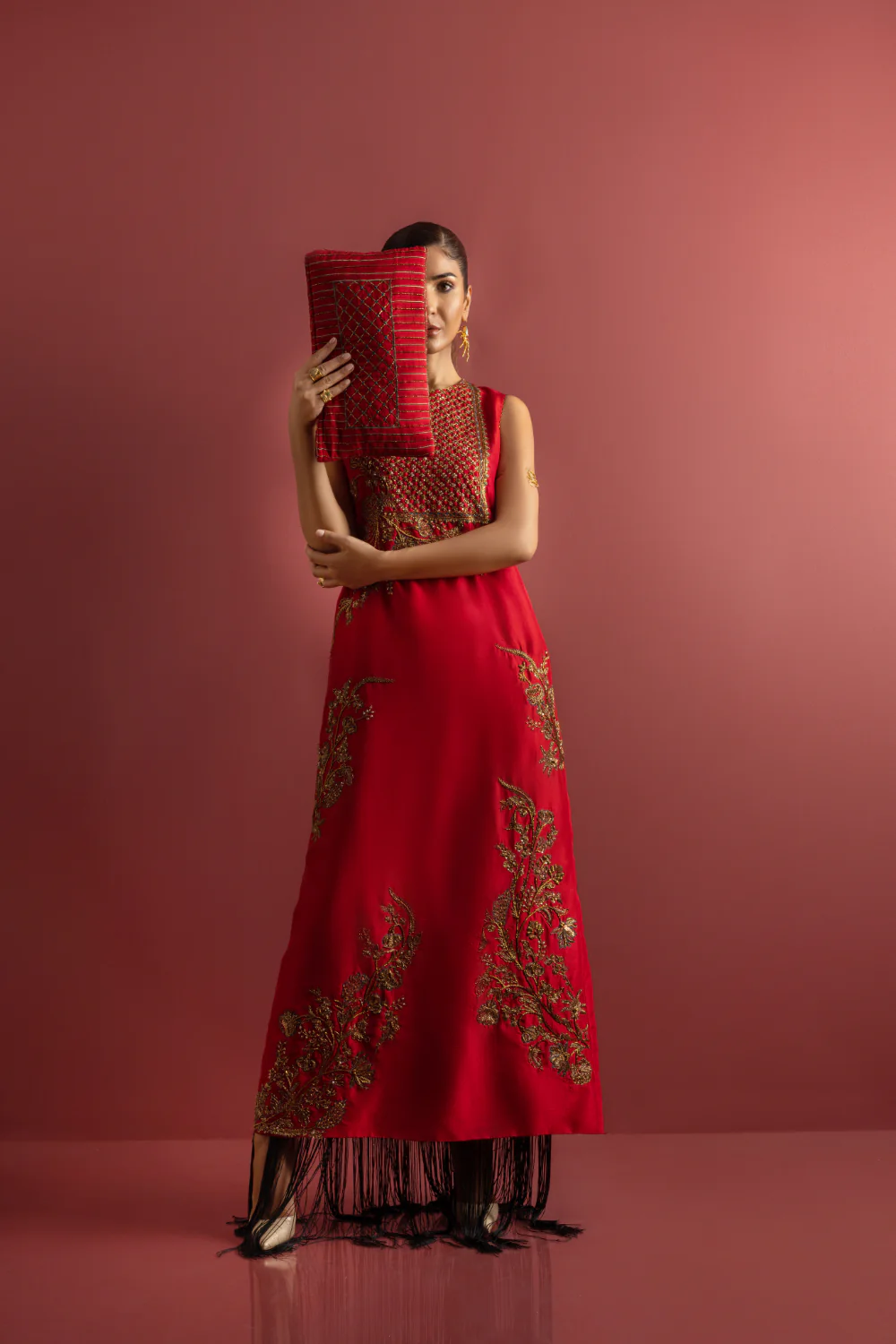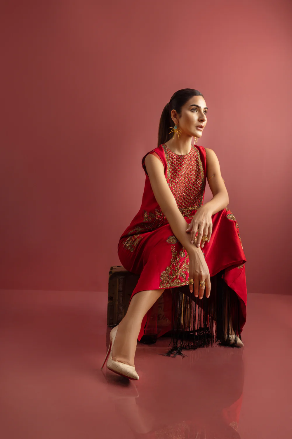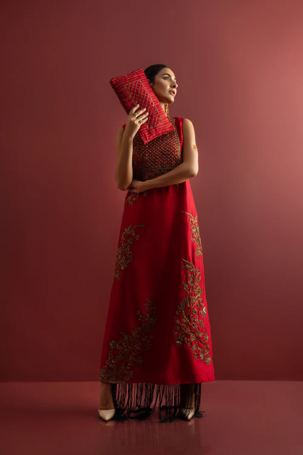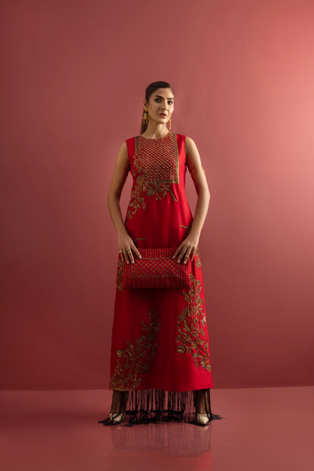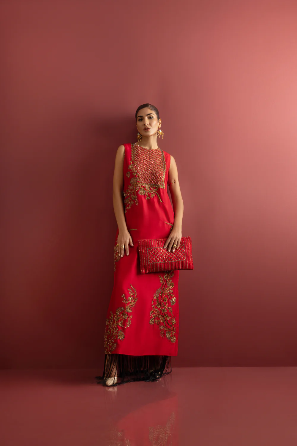 Red raw silk side-open shirt with hand-worked resham, naqshi, cut-dana and Swarovski on front, optional raw silk pants and embroidered net dupatta available on request, elegant, handcrafted, festive and camera-ready