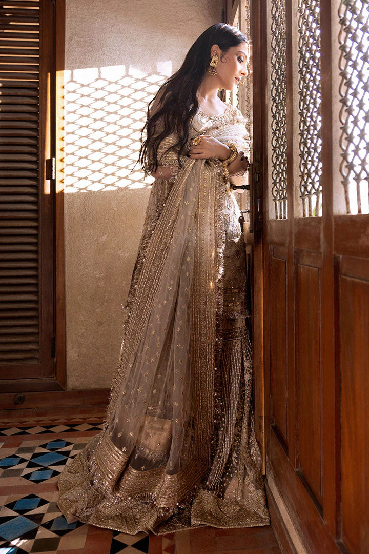 The ensemble is completed with a coordinating dupatta crafted from delicate chiffon or organza. It features borders that complement the kurti and gharara, along with scattered motifs, sequins, and beadwork, adding a soft shimmer and finishing touch to the outfit.