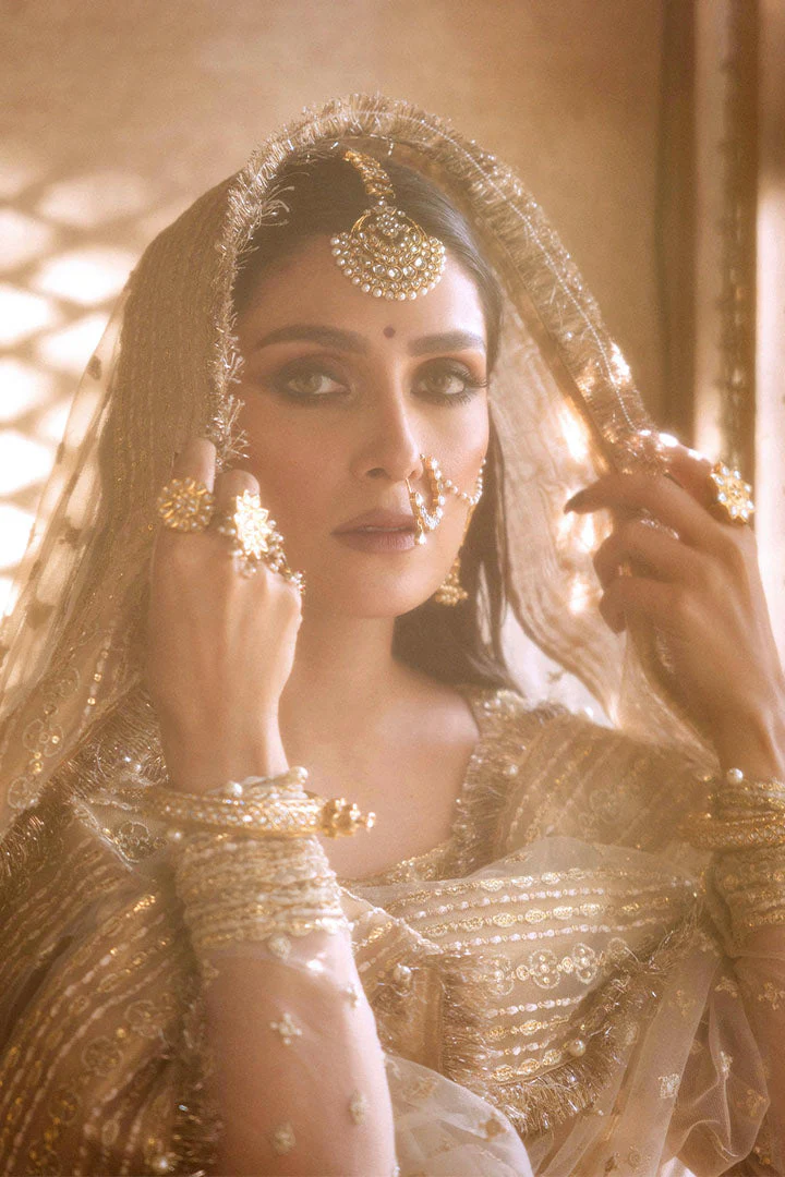 The matching gharara is tailored in a flared silhouette, starting with a structured fit at the hips and flowing into voluminous panels below. Embellished with matching embroidery, sequins, and fine borders, it creates a striking contrast with the kurti and adds regal movement. Fully lined for comfort, it offers ease of wear without compromising on elegance.