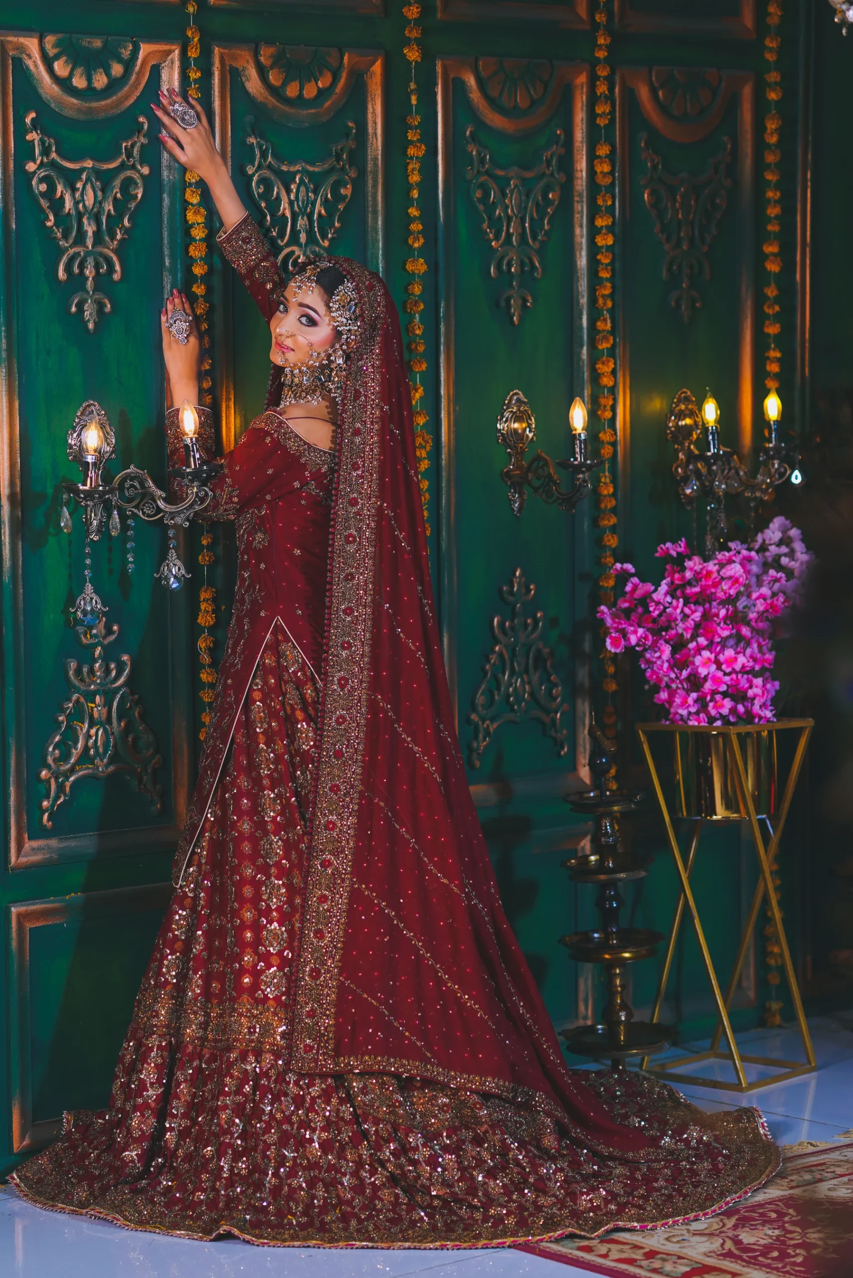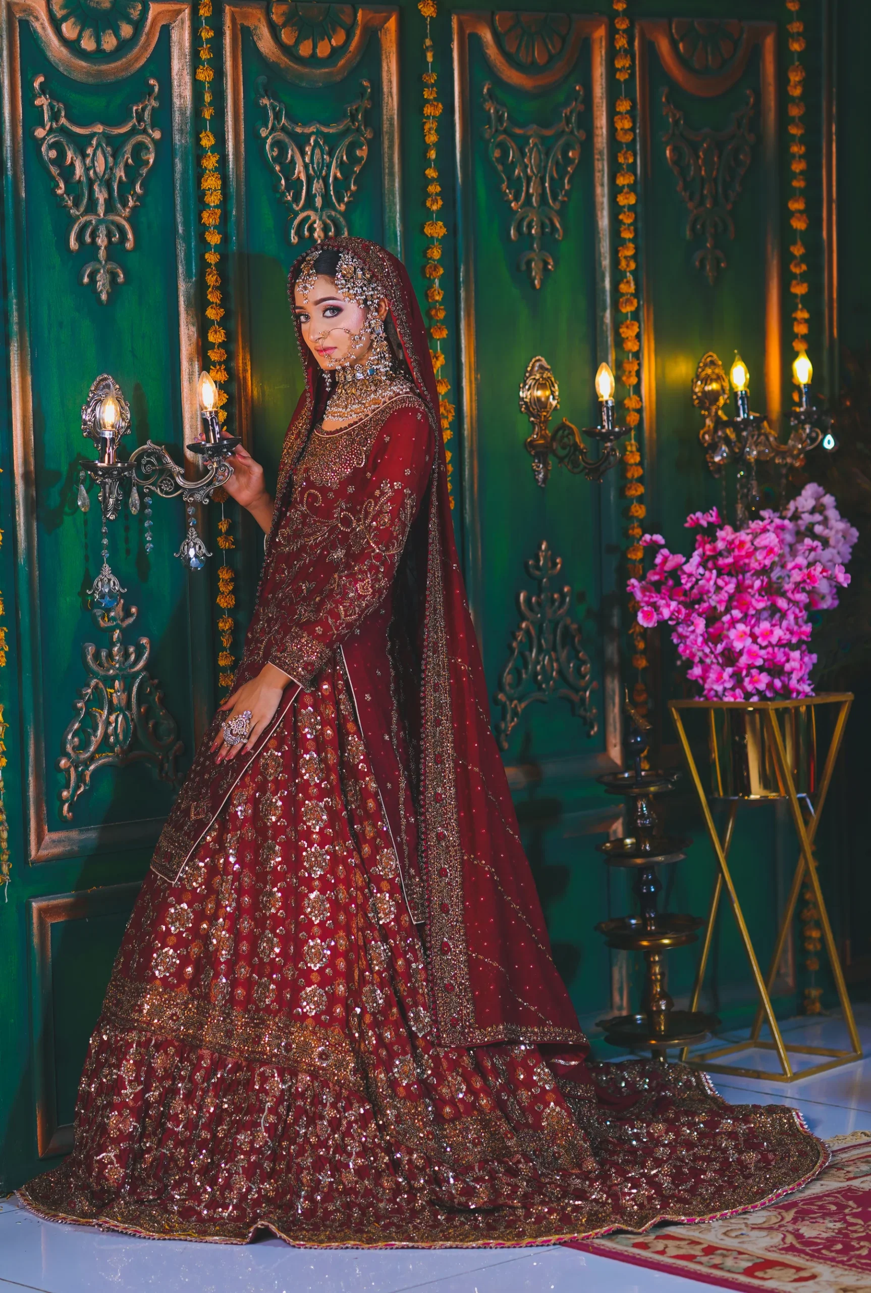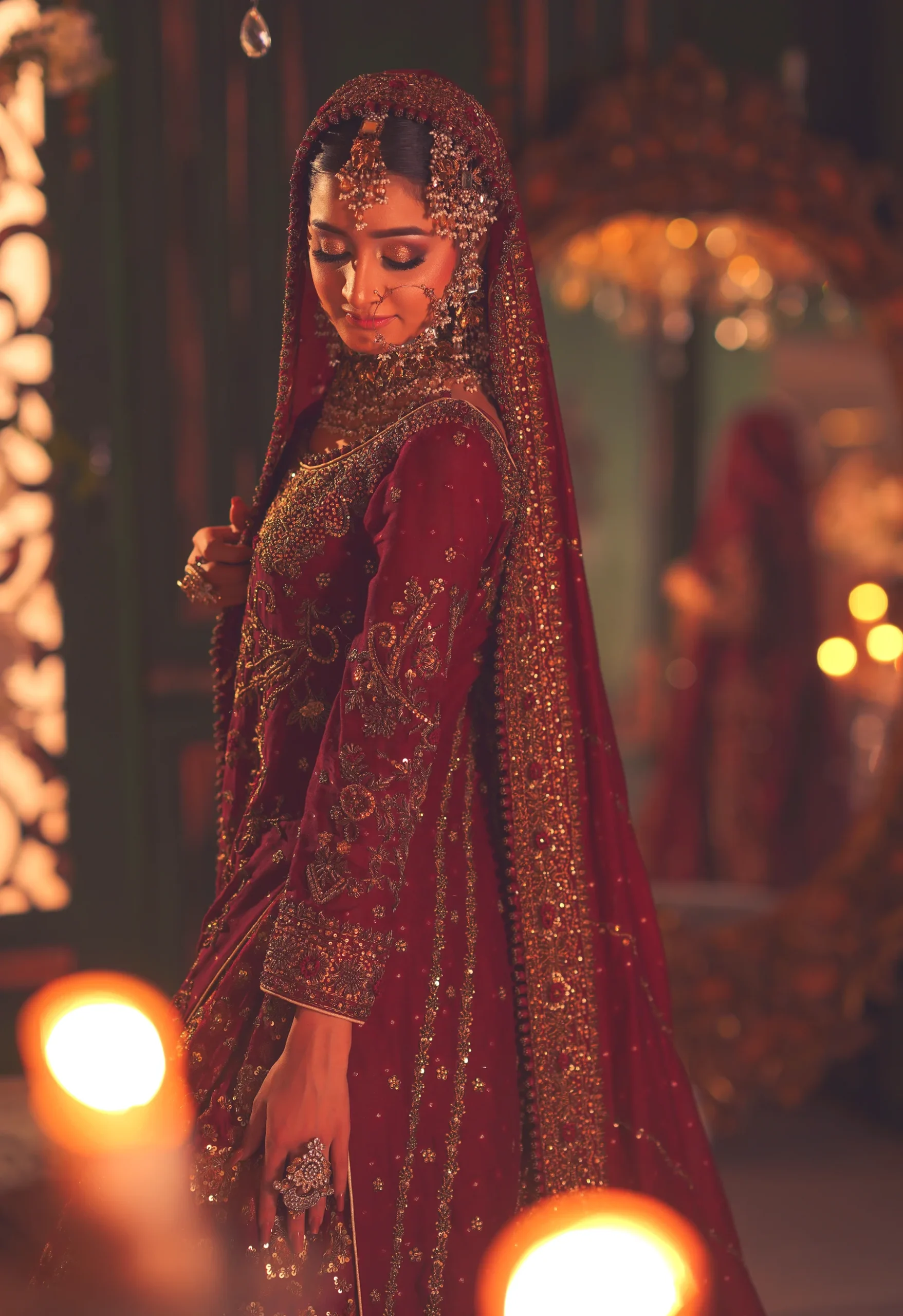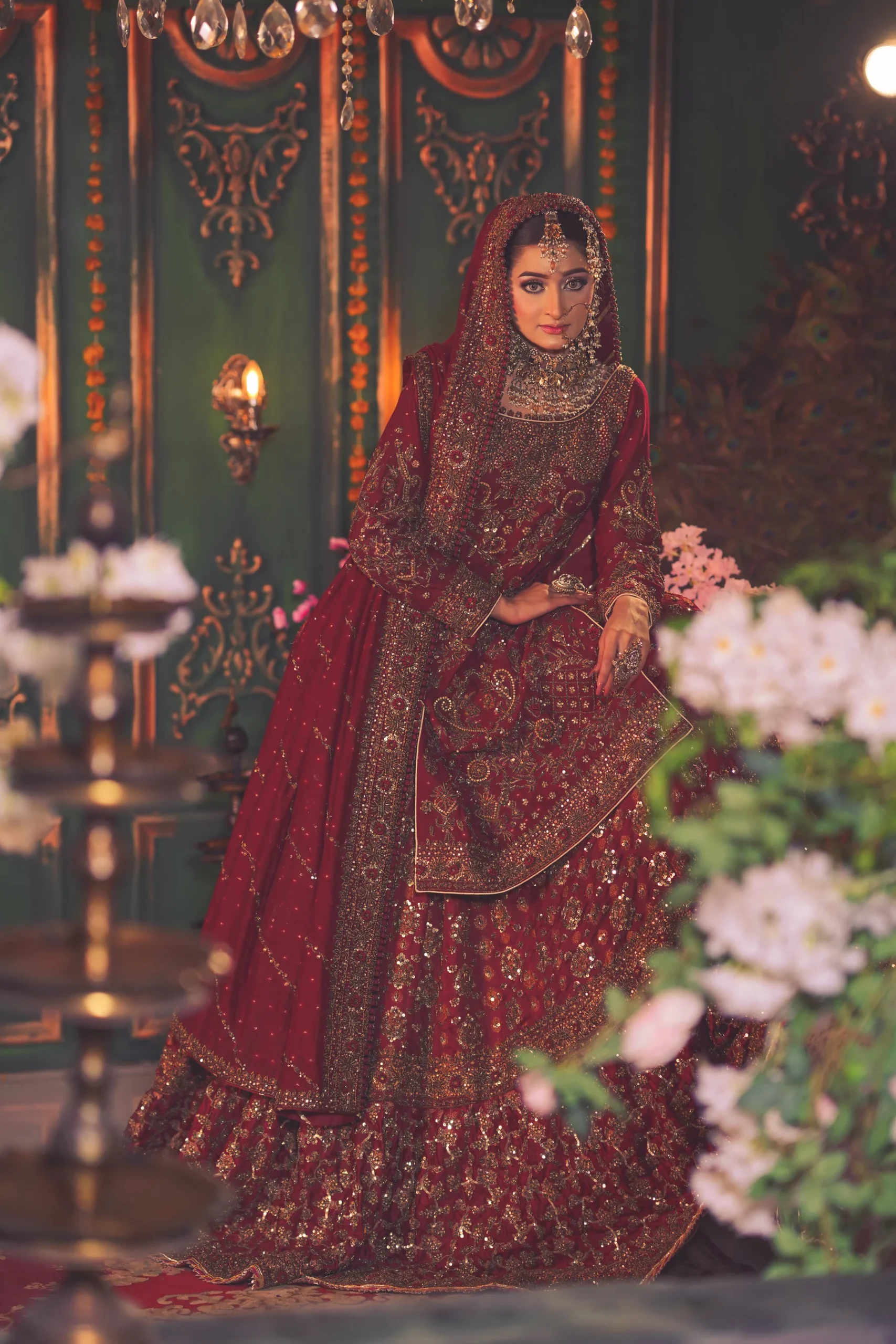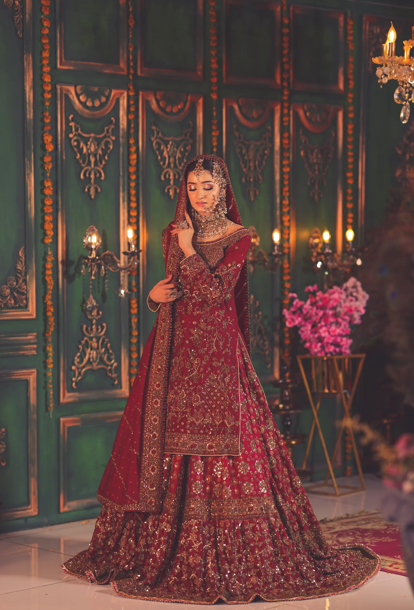 A luxurious maroon bridal couture lehenga adorned with antique gold zari, crystals, and sequins, paired with an intricately embellished dupatta for a timeless royal wedding look.