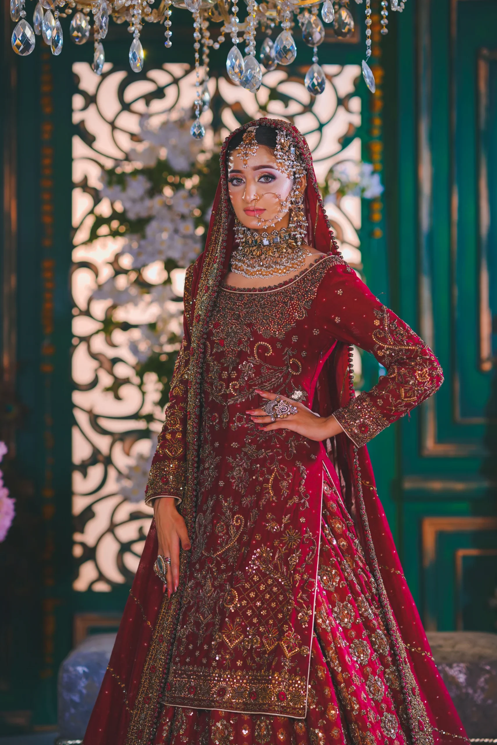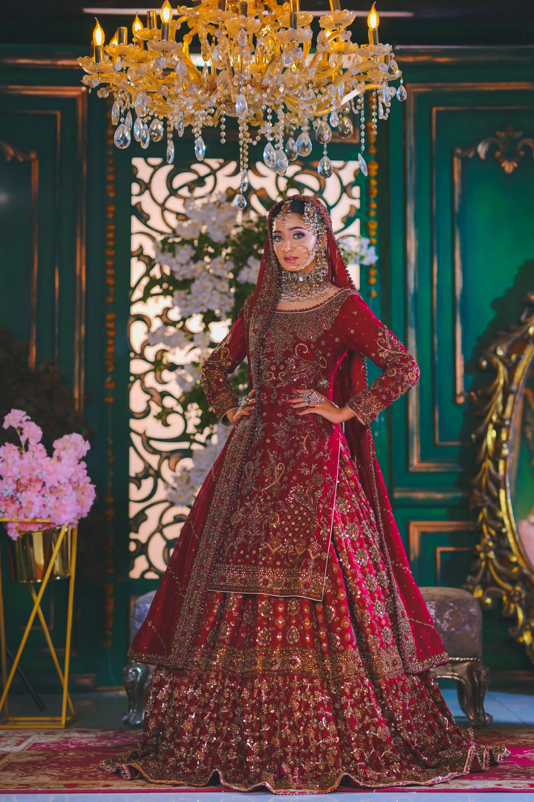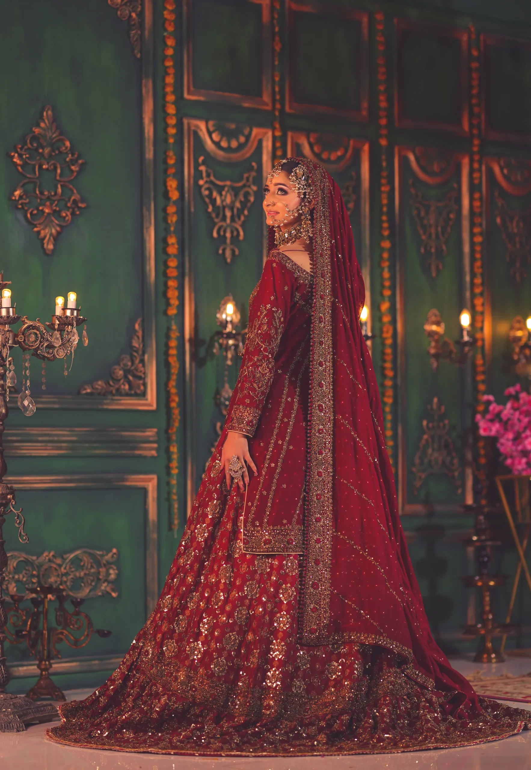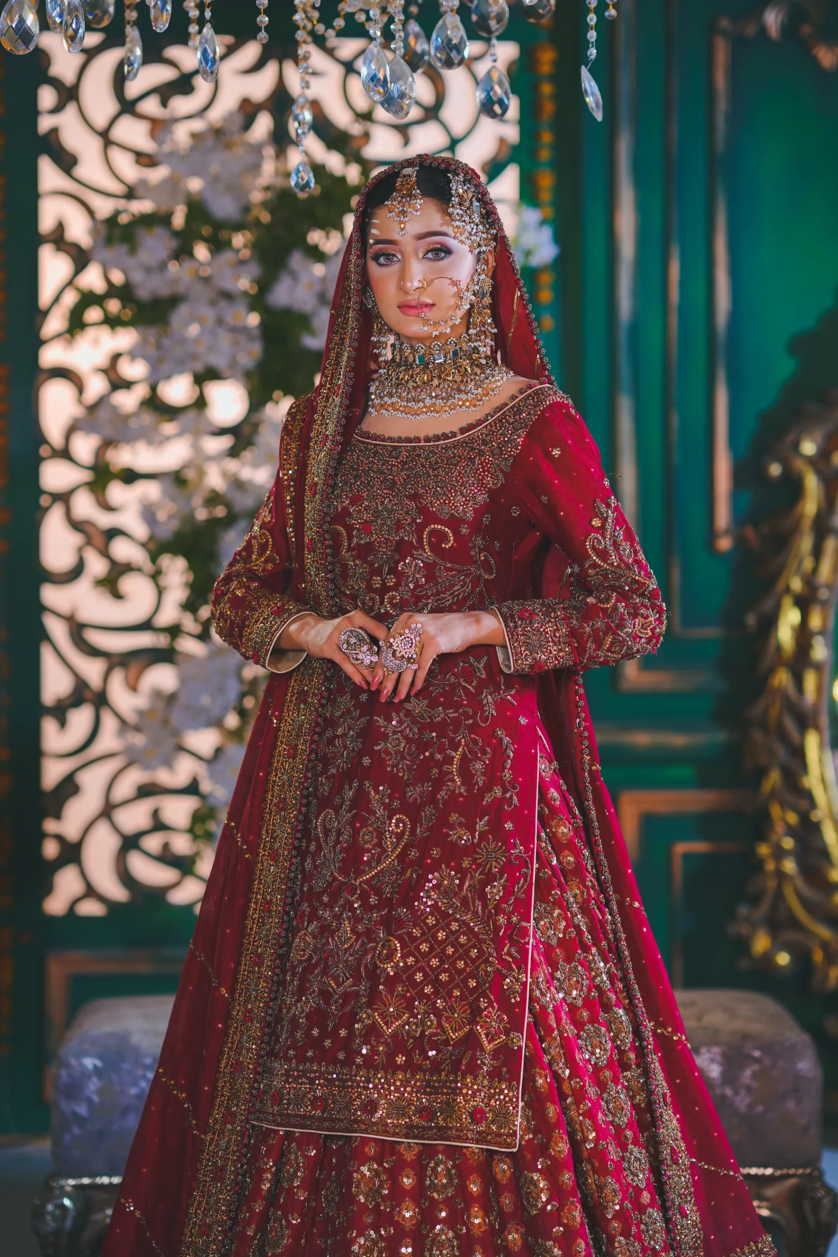 A luxurious maroon bridal couture lehenga adorned with antique gold zari, crystals, and sequins, paired with an intricately embellished dupatta for a timeless royal wedding look.