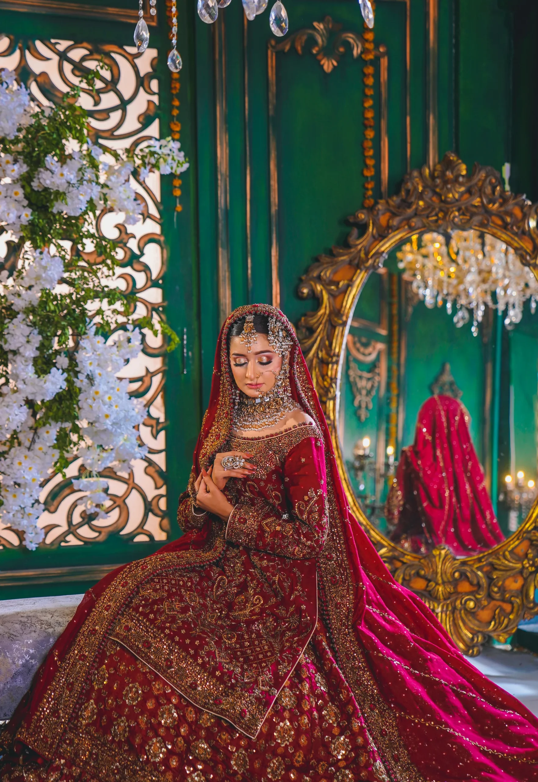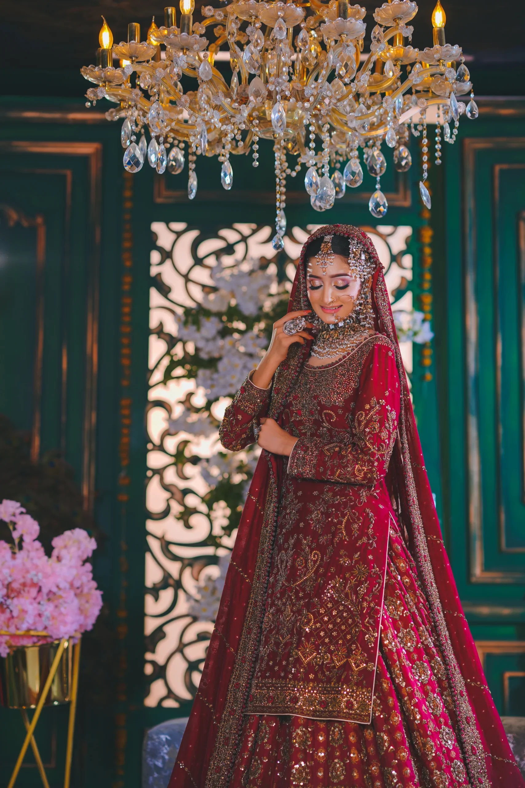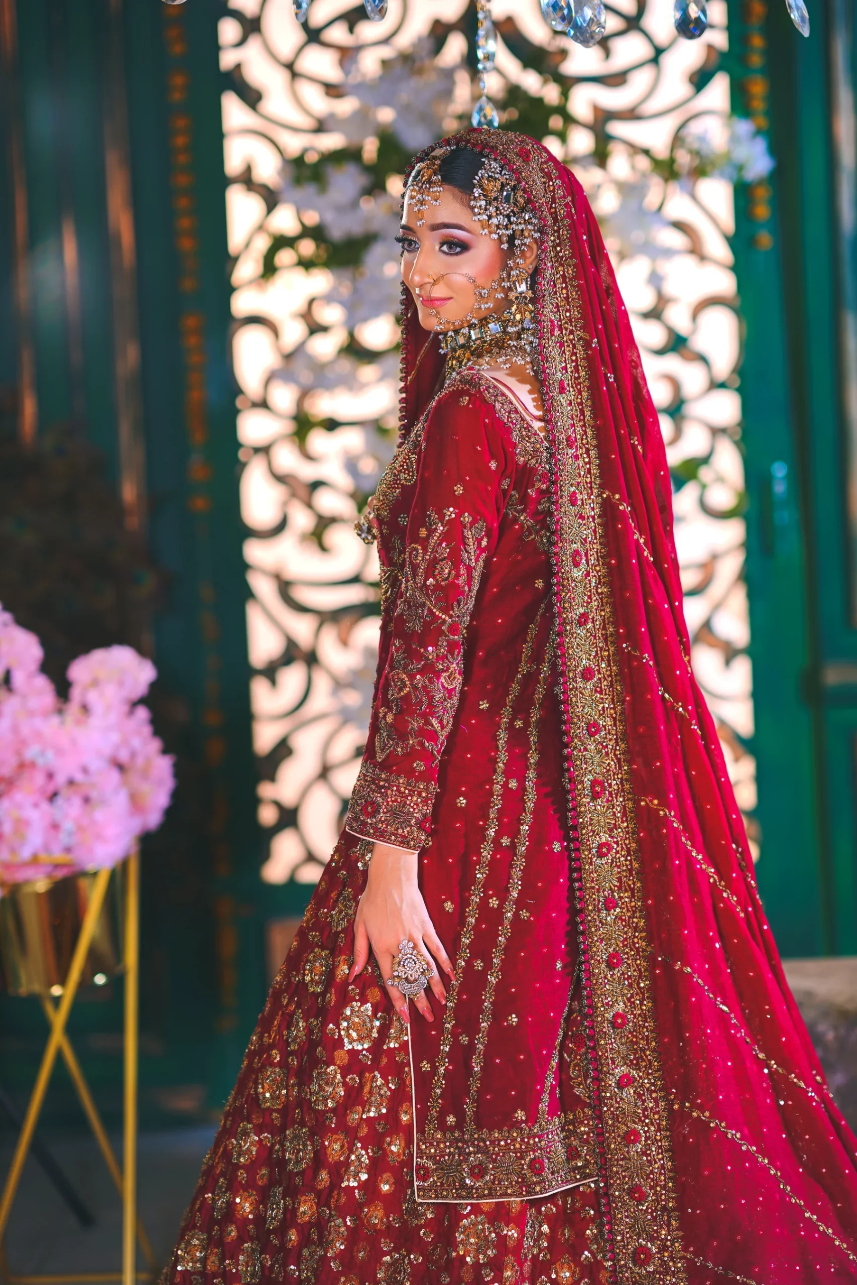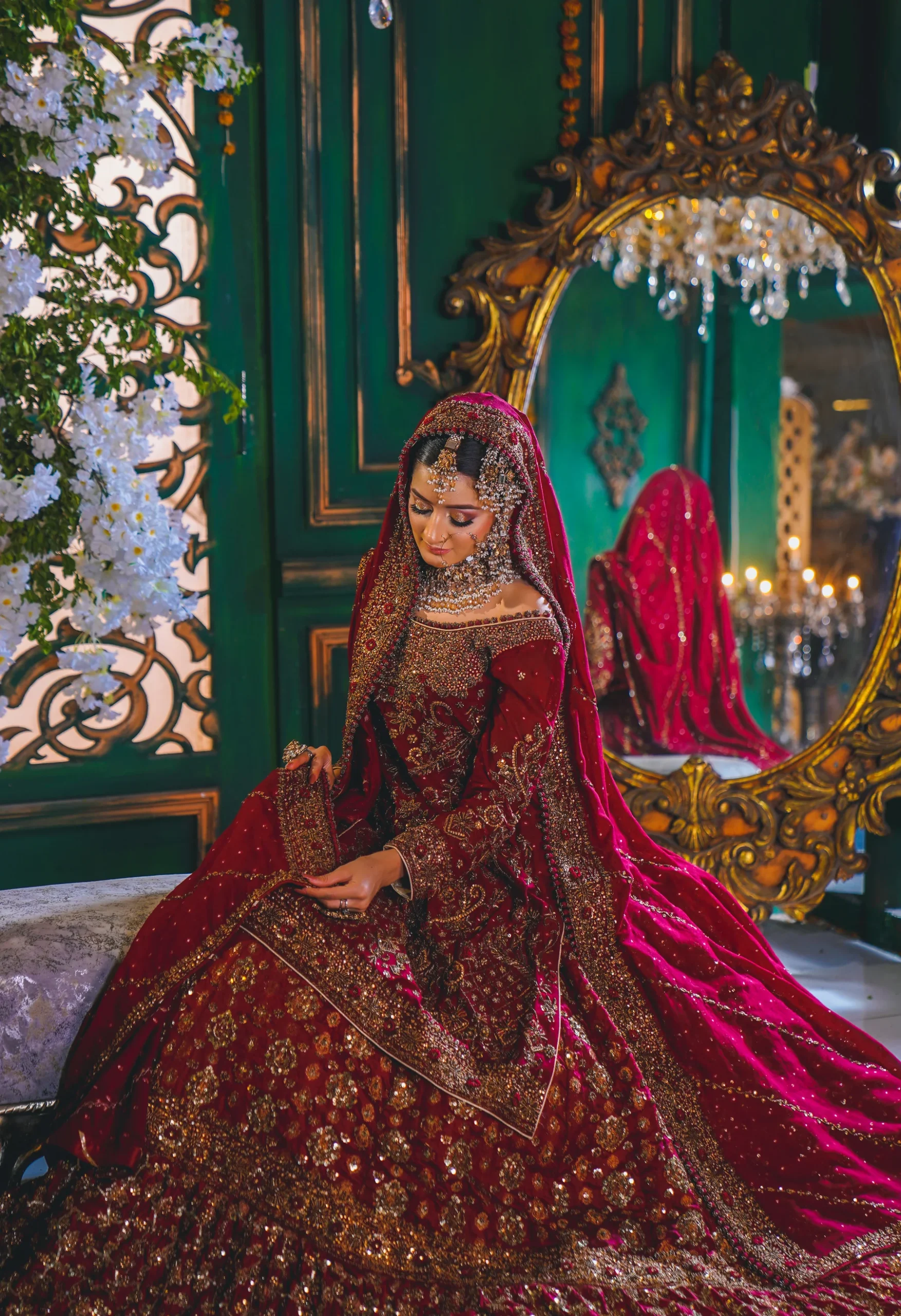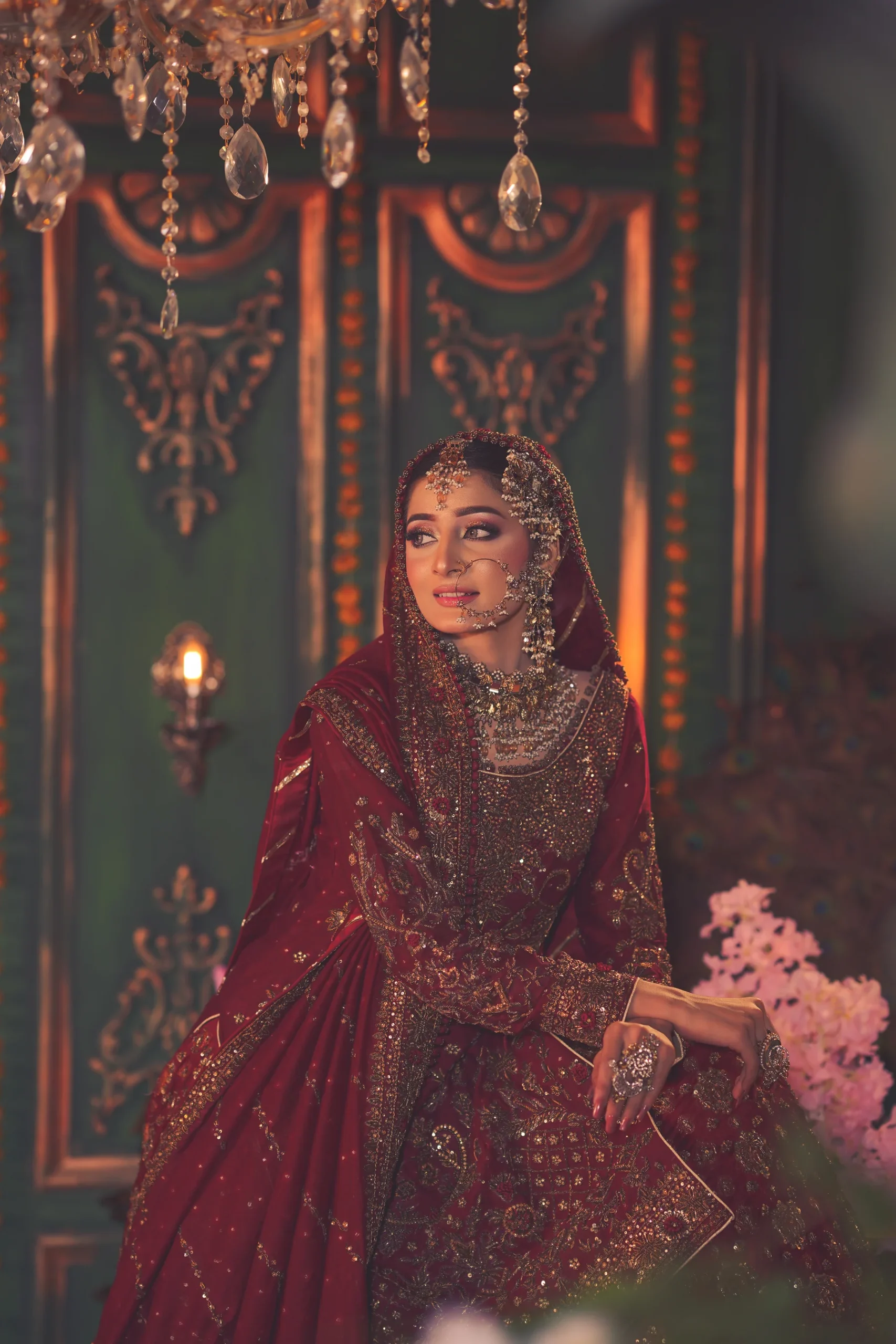 A luxurious maroon bridal couture lehenga adorned with antique gold zari, crystals, and sequins, paired with an intricately embellished dupatta for a timeless royal wedding look.
