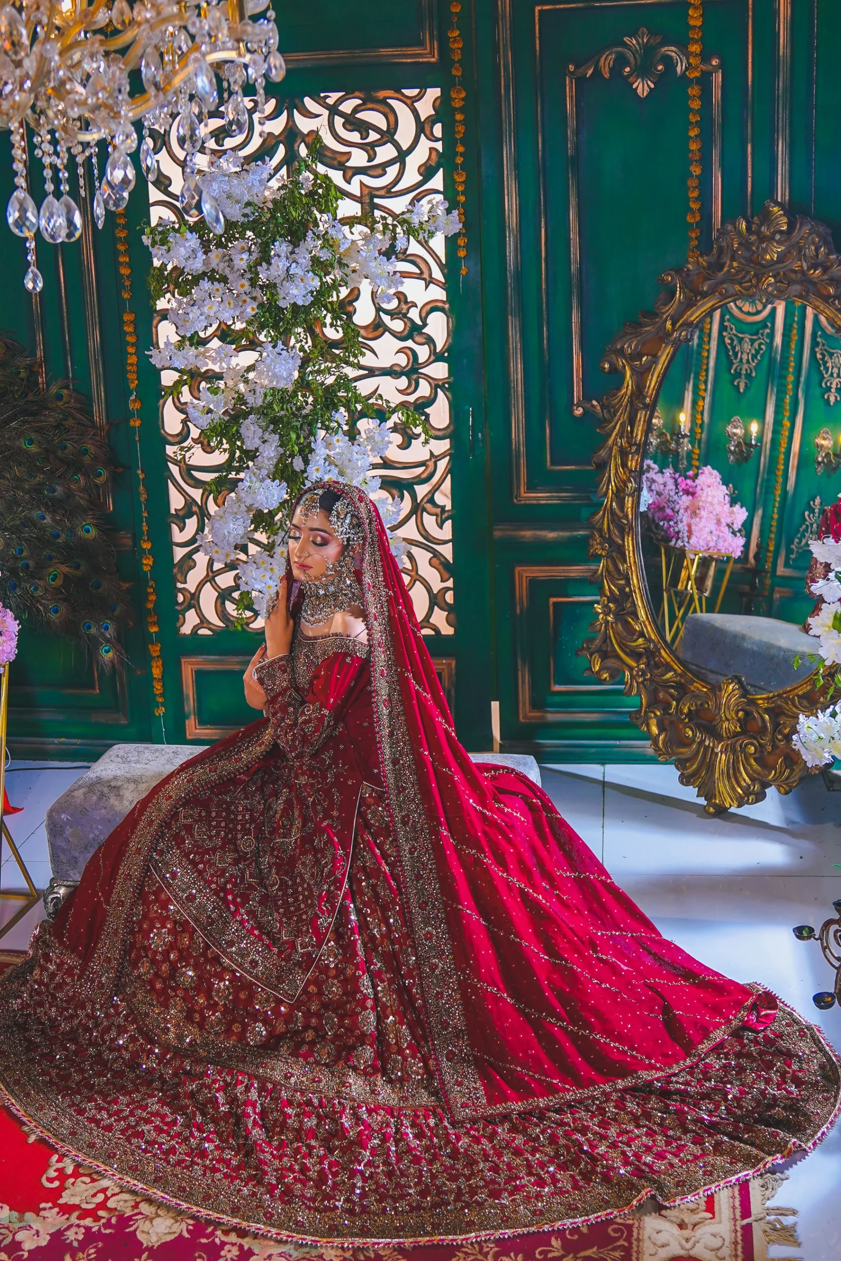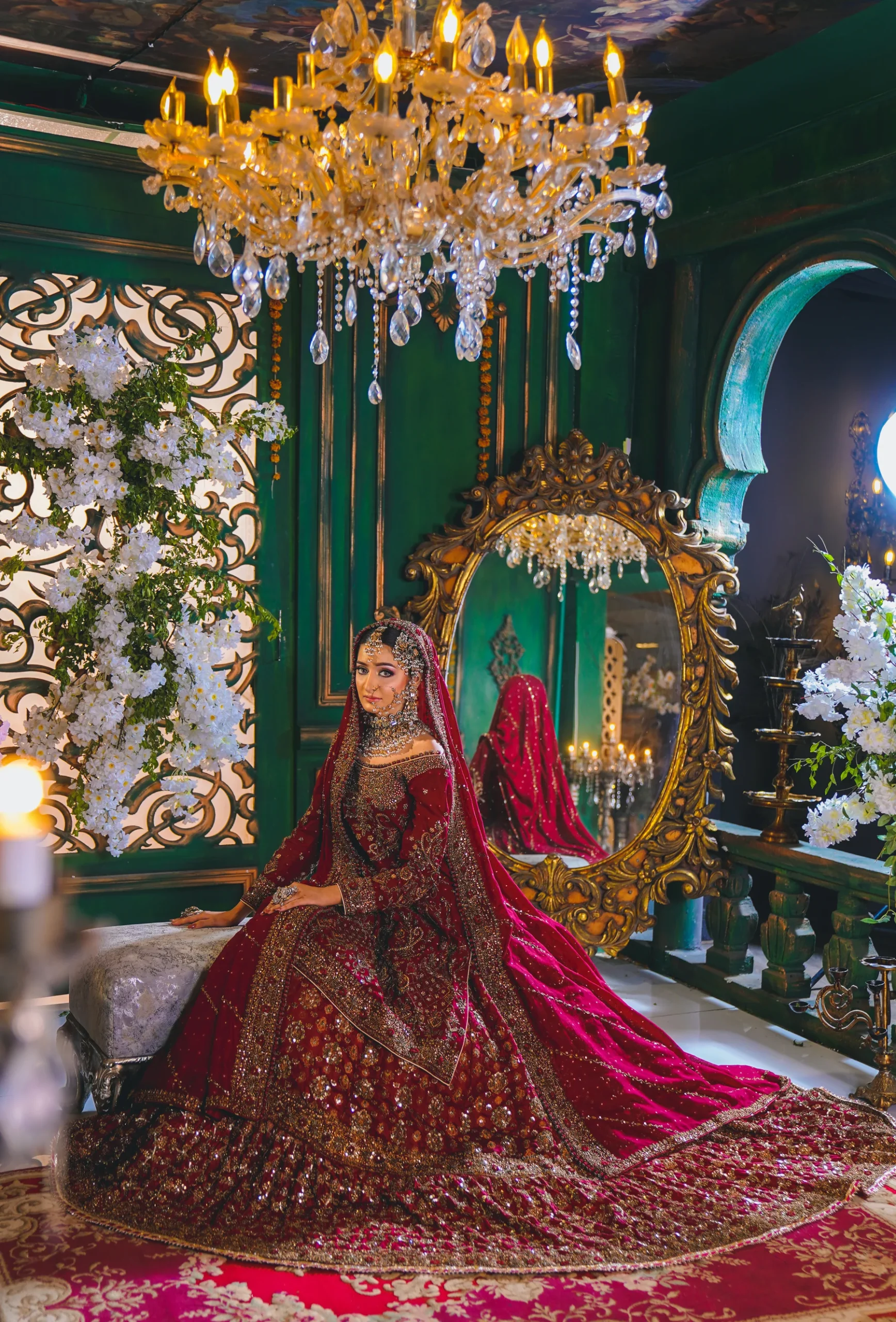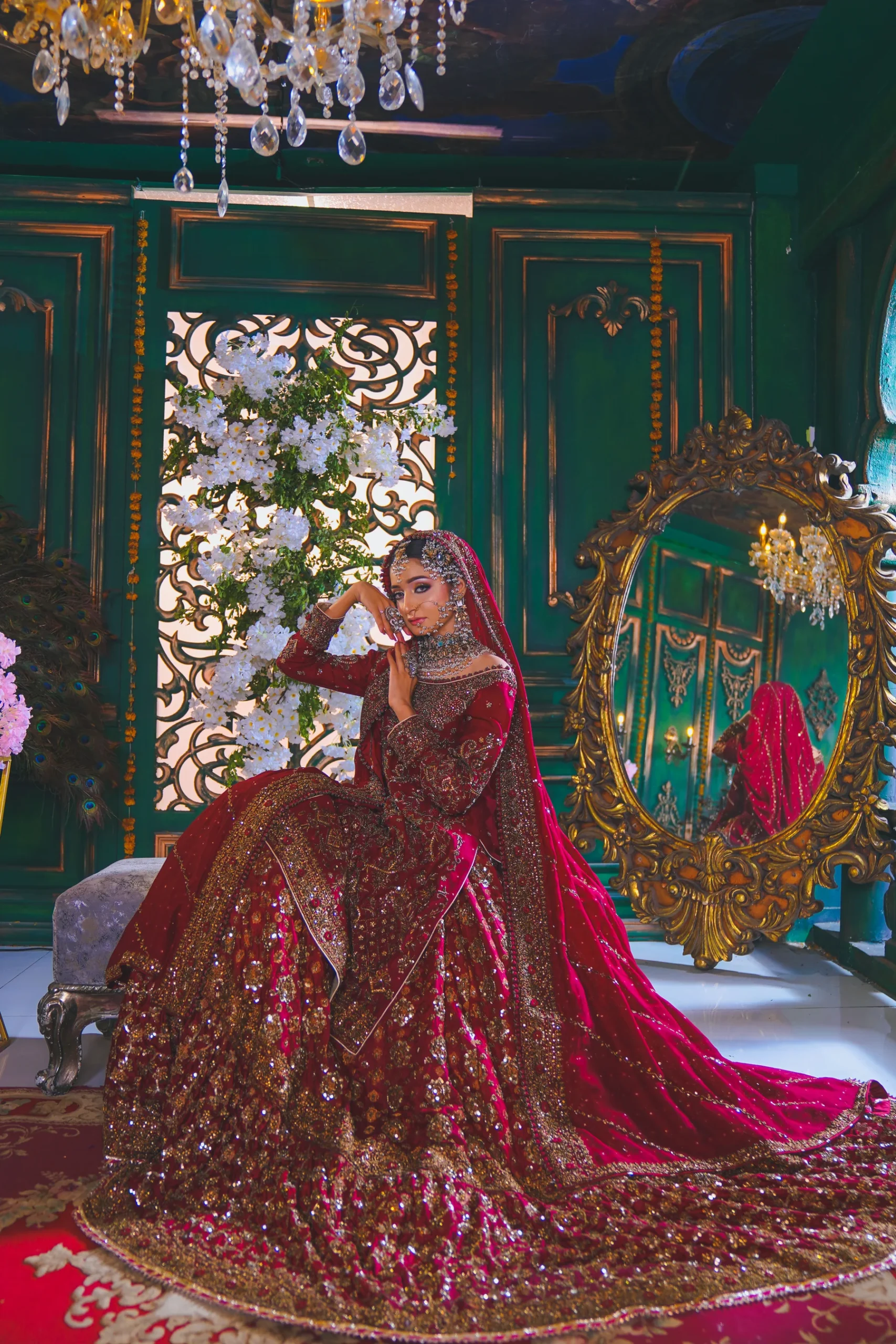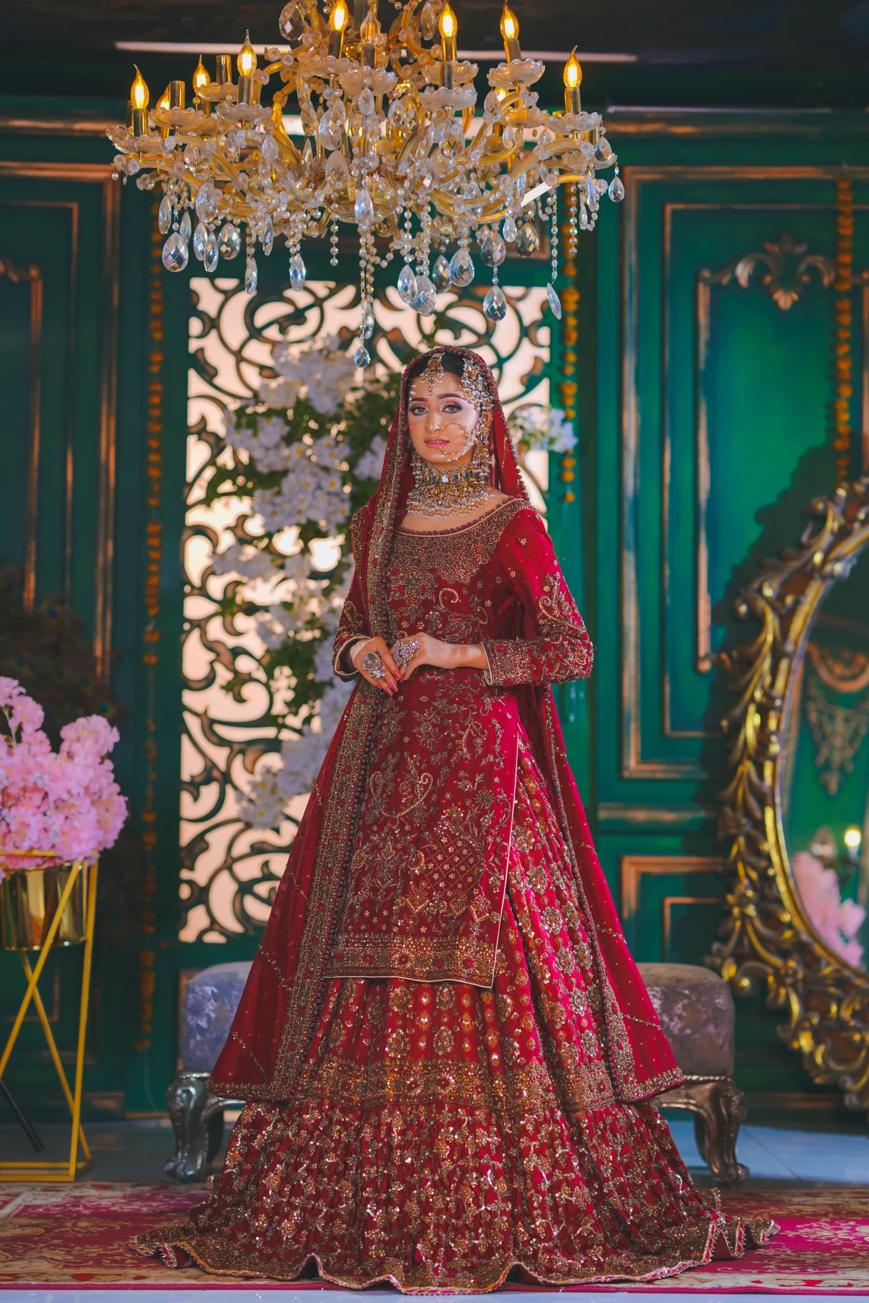 A luxurious maroon bridal couture lehenga adorned with antique gold zari, crystals, and sequins, paired with an intricately embellished dupatta for a timeless royal wedding look.