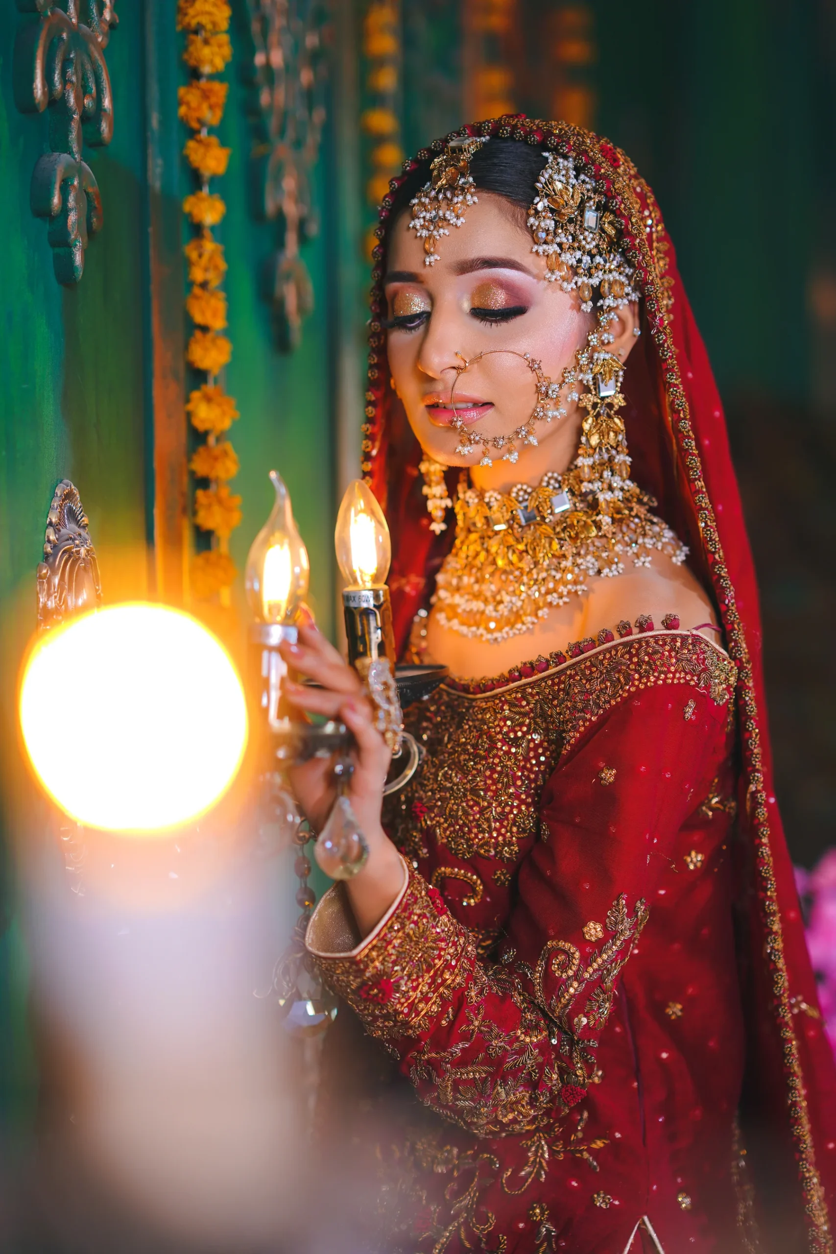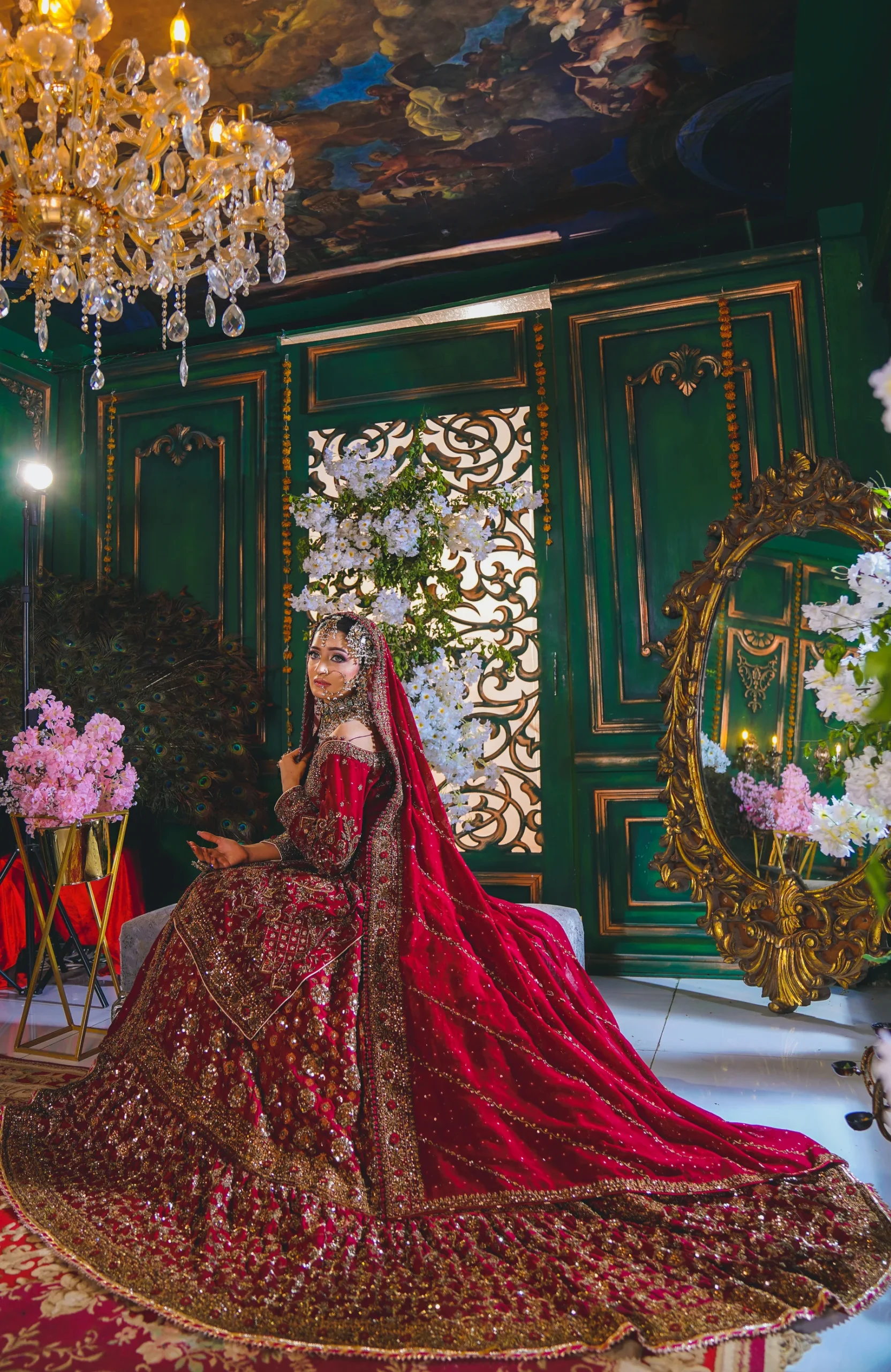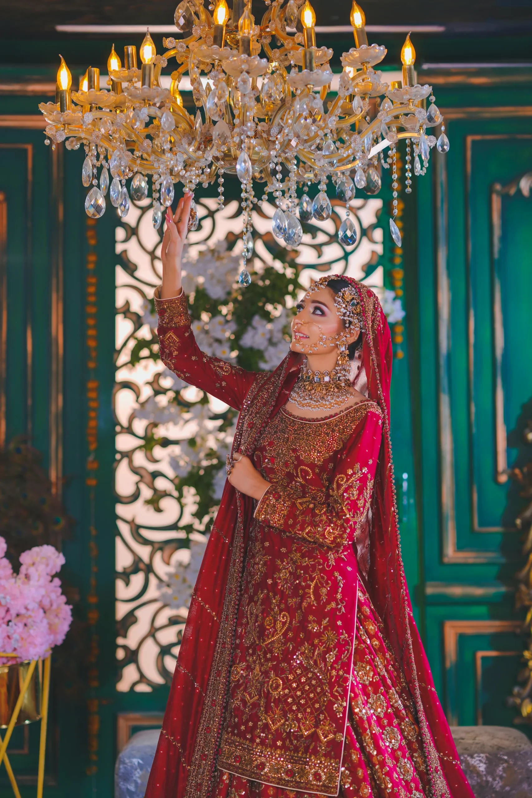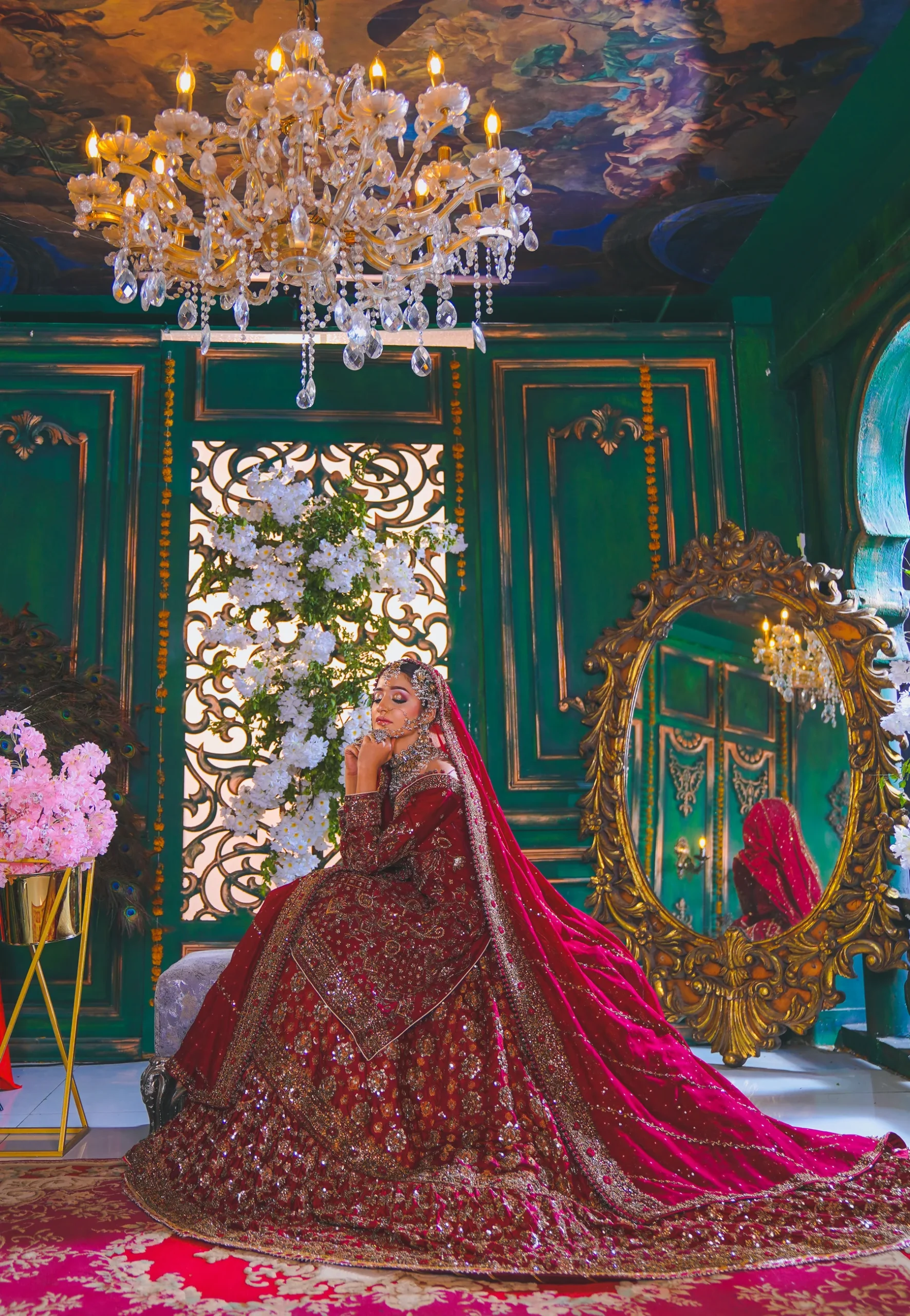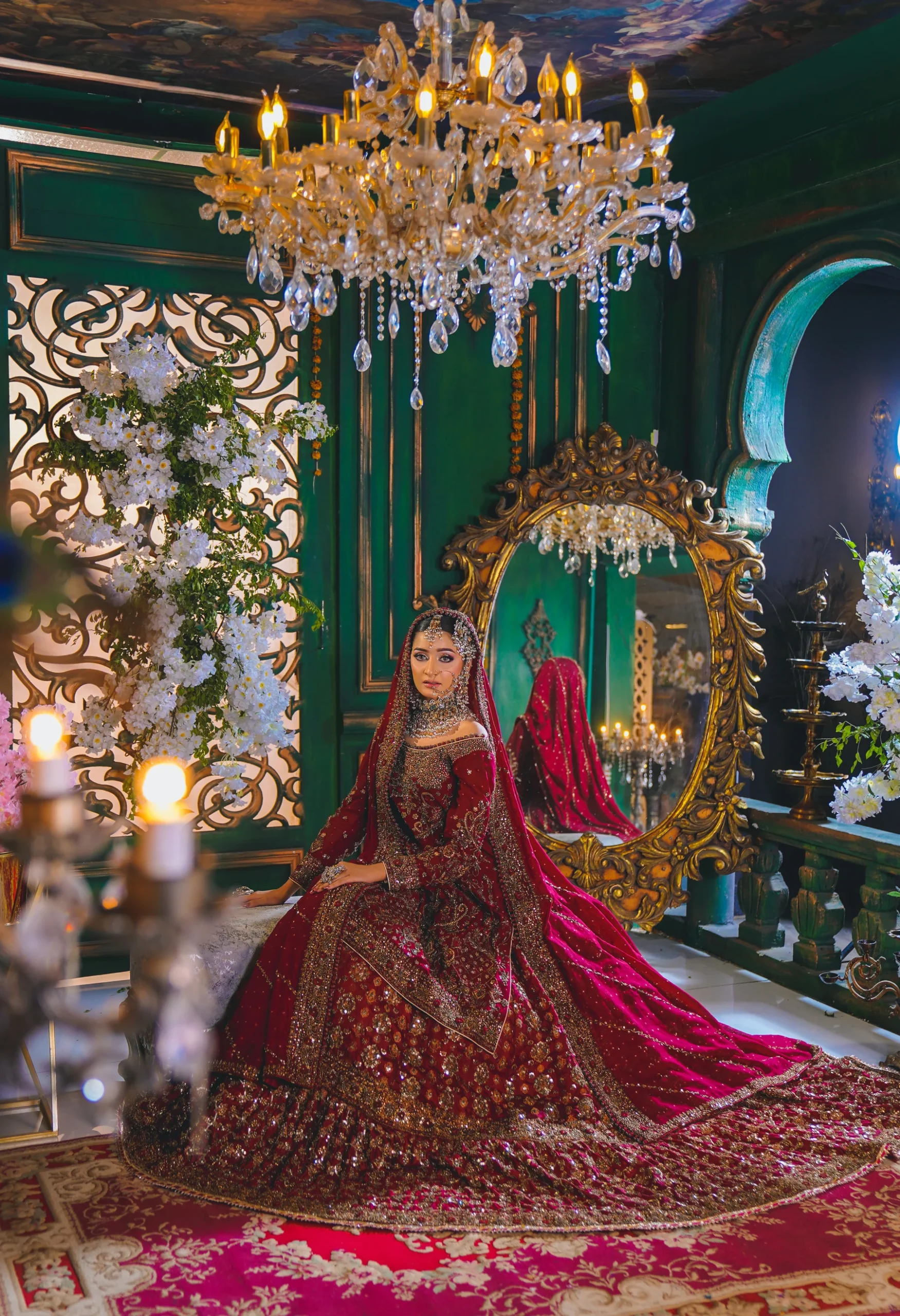 A luxurious maroon bridal couture lehenga adorned with antique gold zari, crystals, and sequins, paired with an intricately embellished dupatta for a timeless royal wedding look.