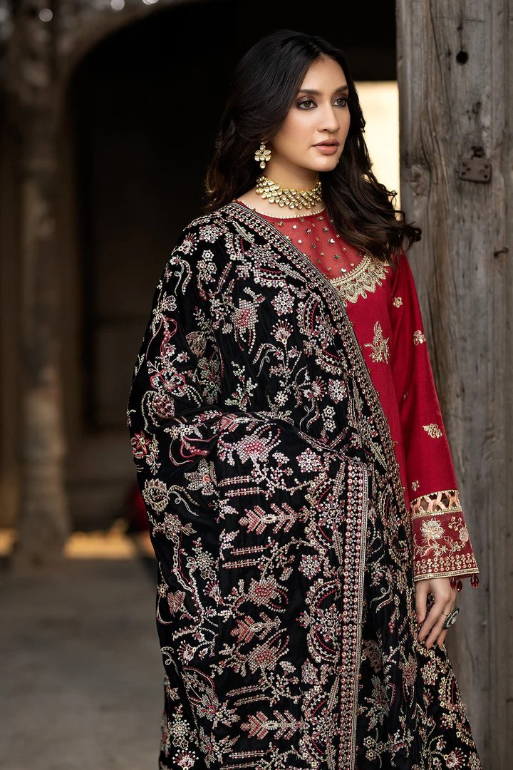 The ensemble is completed with a premium net dupatta that adds a soft, flowing dimension to the outfit. The dupatta features delicate embroidery along the borders and fine detailing throughout, harmonizing beautifully with the rich maroon kameez and raw silk trousers. Its lightweight texture ensures graceful draping, creating a charismatic and festive appearance.