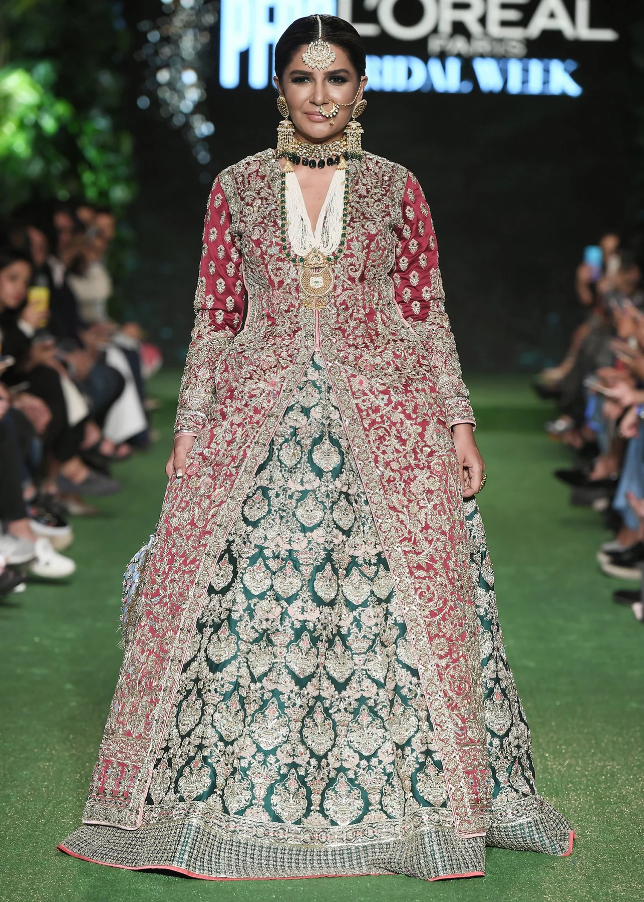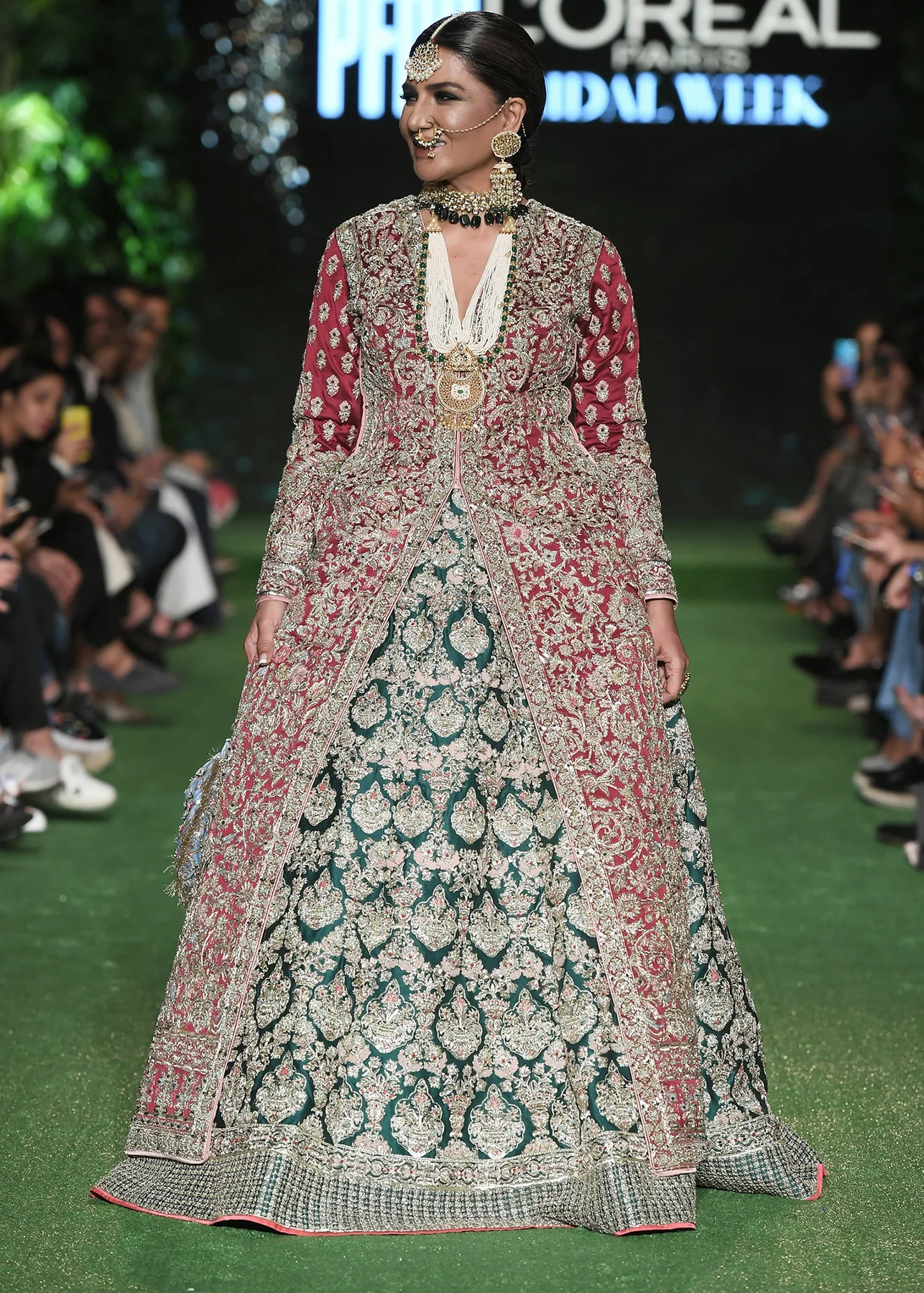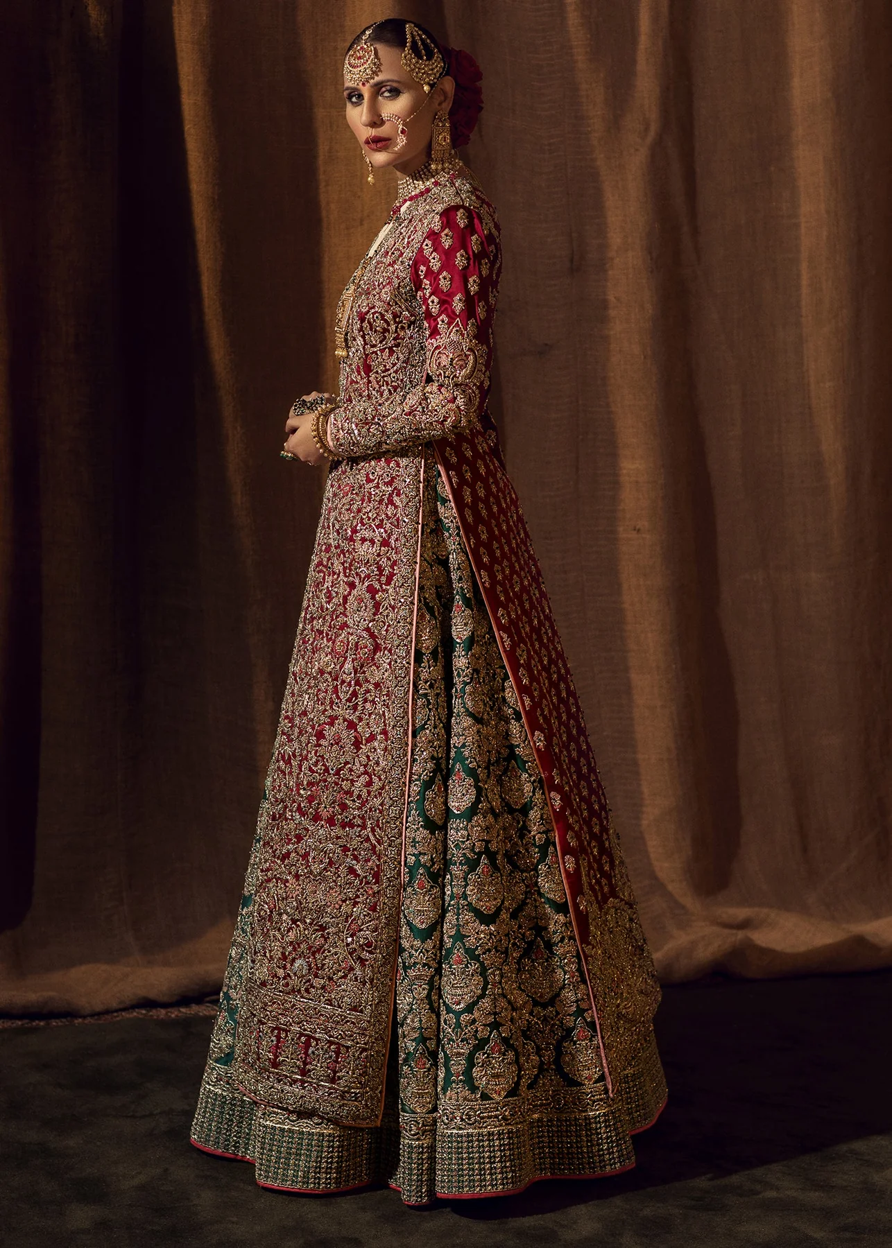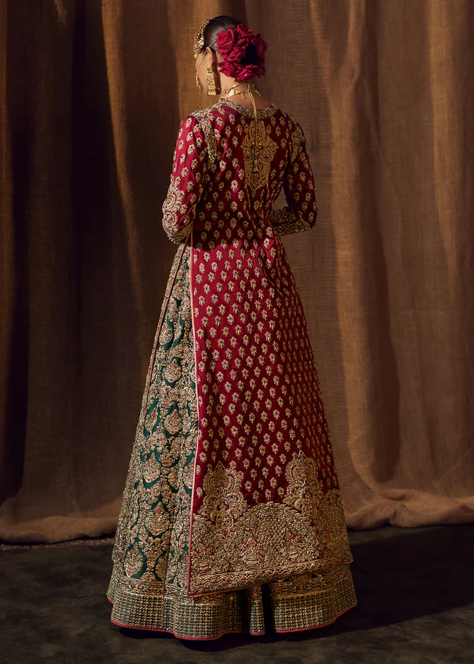 An opulent bridal ensemble featuring a maroon open-jacket silhouette over a majestic emerald green lehenga, fully encrusted with traditional gold handwork.