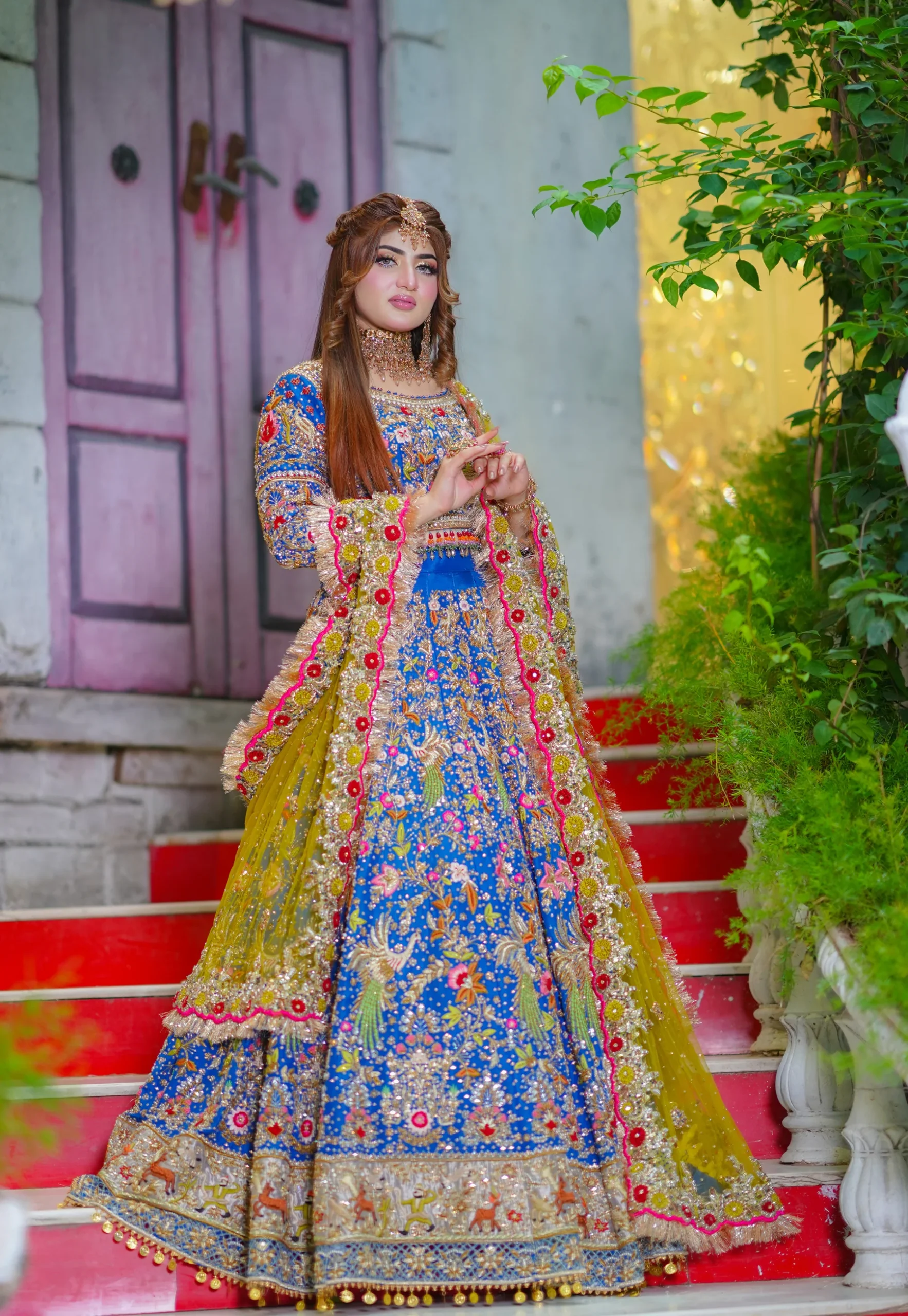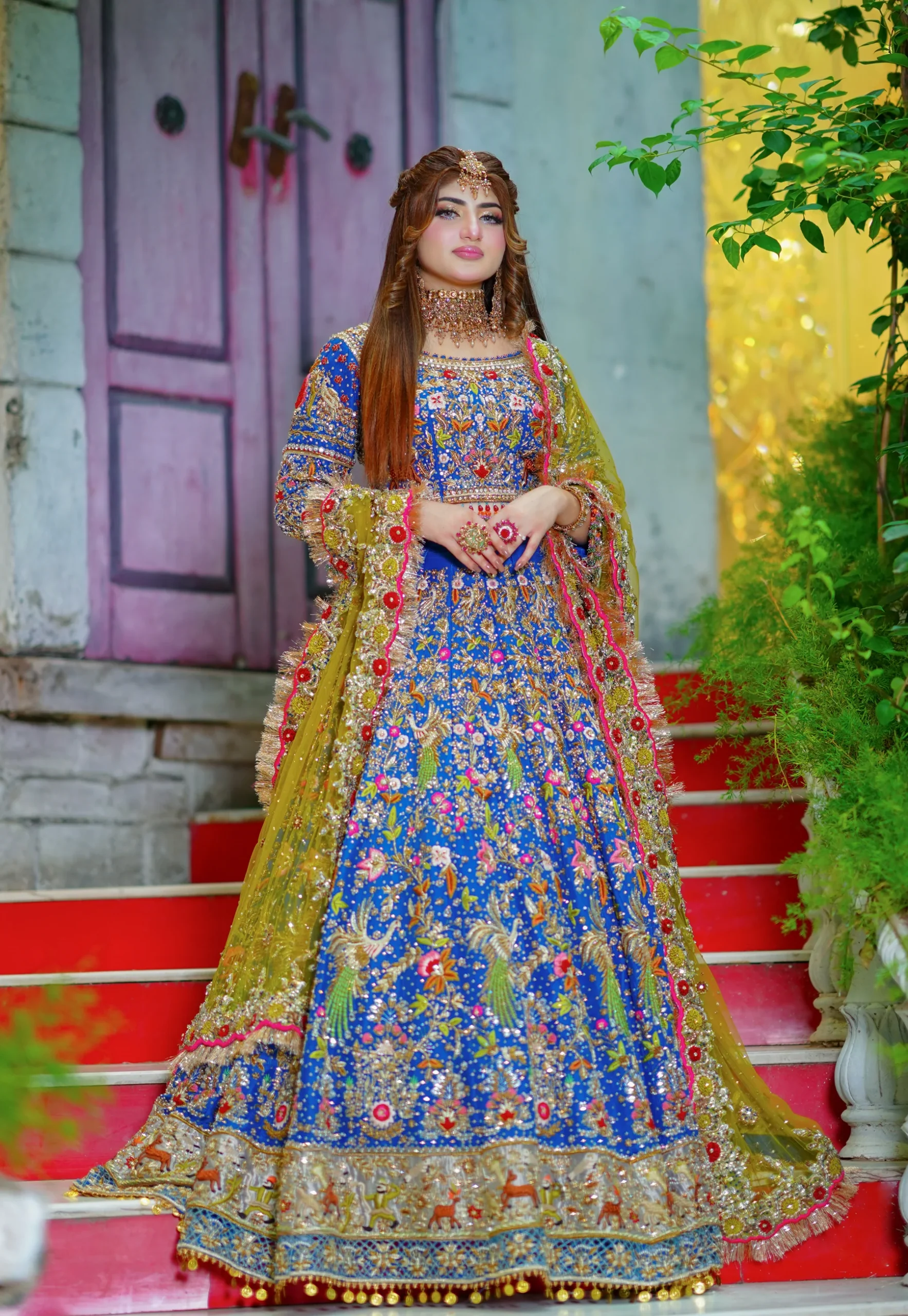 An opulent royal blue bridal lehenga enriched with accents of gold, red, and mustard yellow. Featuring exquisite zardozi, tilla, and resham embroidery with peacock and floral motifs, this regal creation is completed with a vibrant mustard dupatta for timeless Pakistani bridal grandeur.