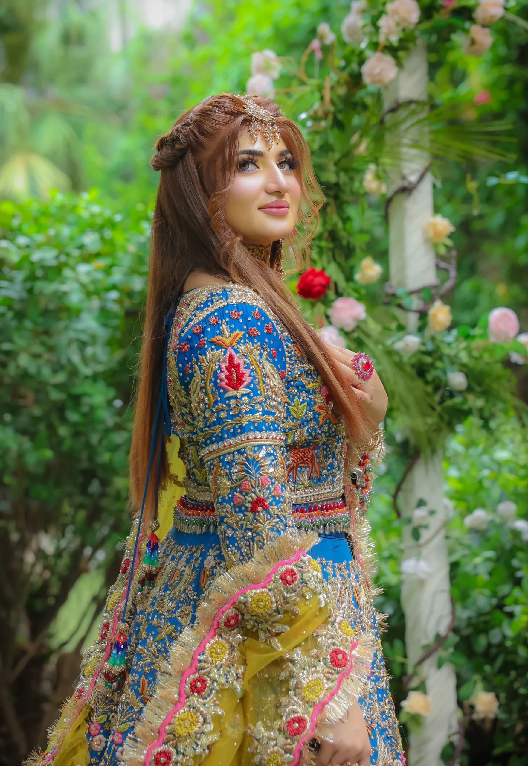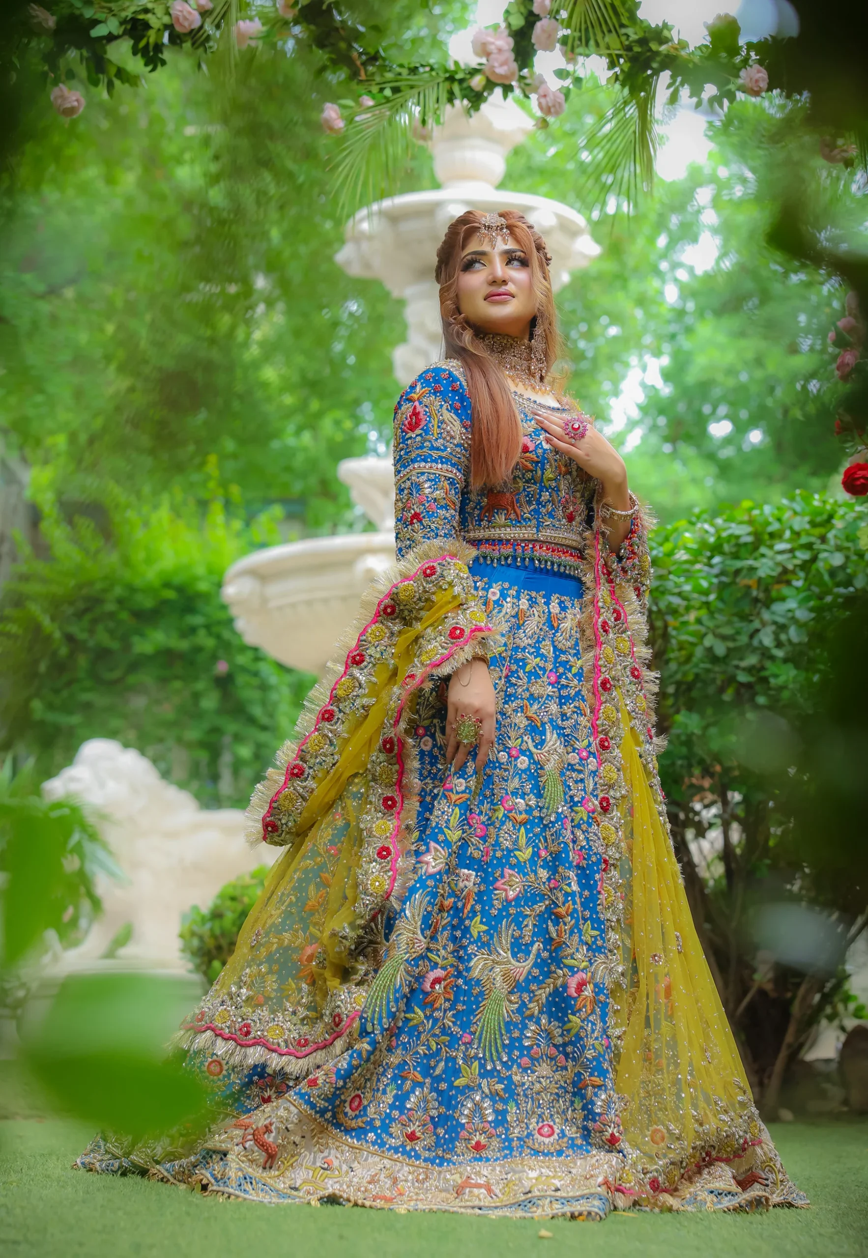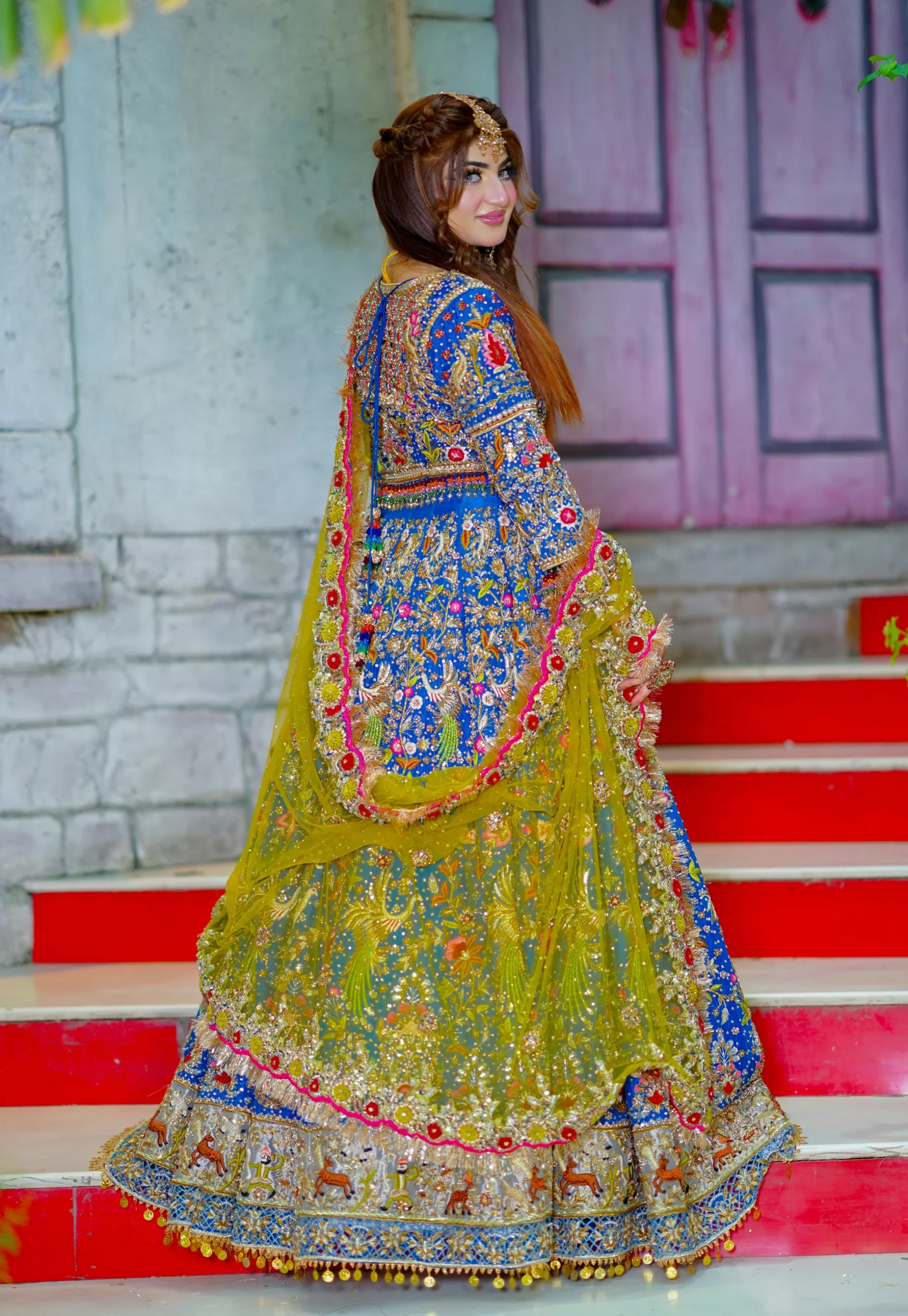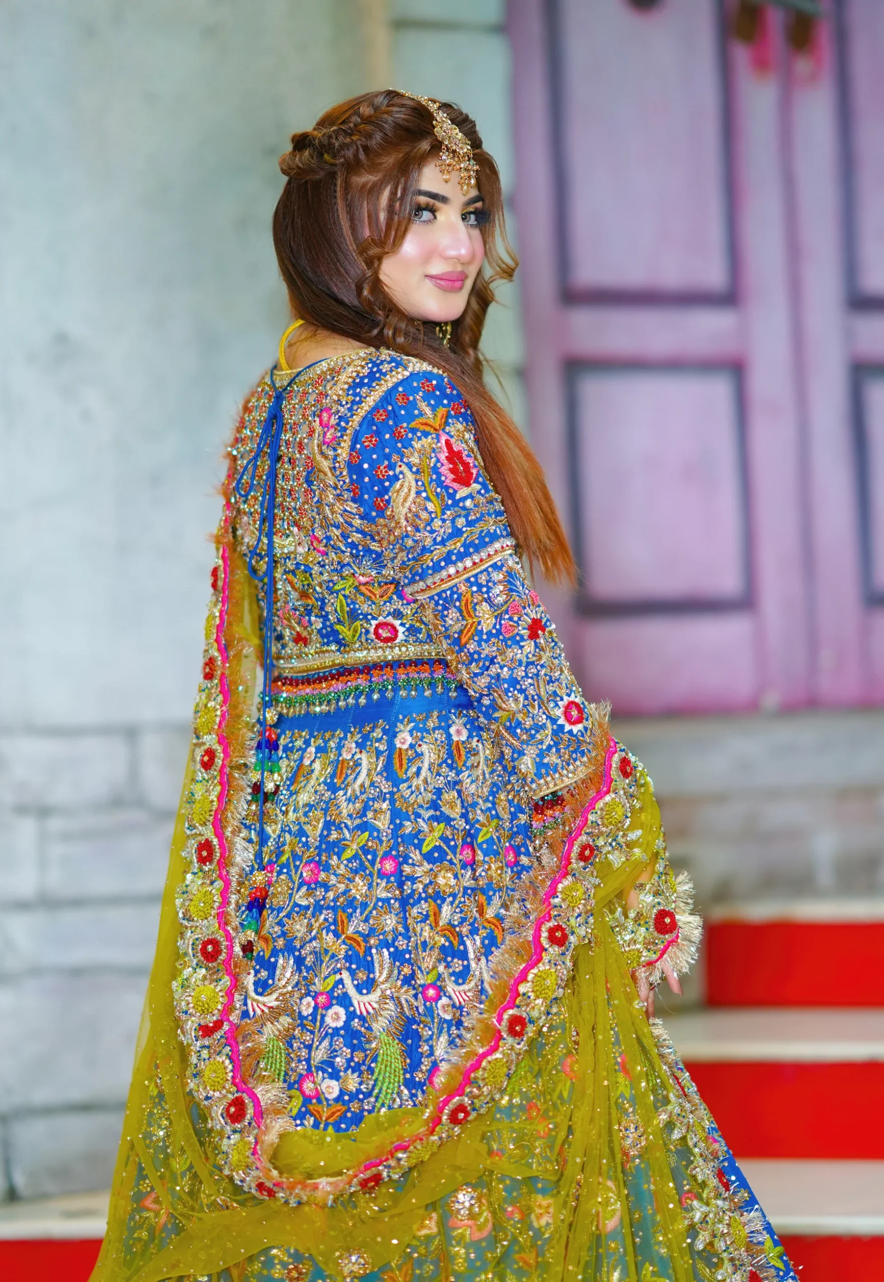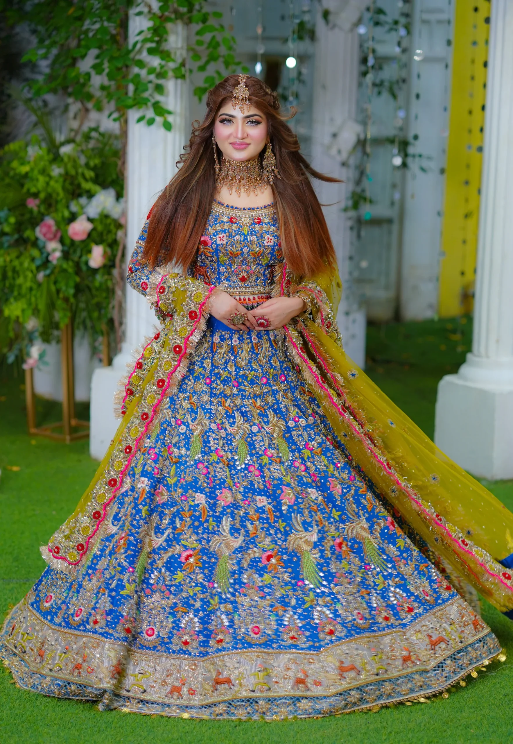 The contrast dupatta is crafted in a vibrant mustard tone, adding a festive and striking balance to the deep blue base. It is bordered with colorful embellishments, gold appliqué, and intricate hand embroidery that echo the motifs of the lehenga. Sequins, beads, and delicate detailing lend brilliance across the dupatta, while a refined katan lining along the edges provides structure without compromising its graceful drape.