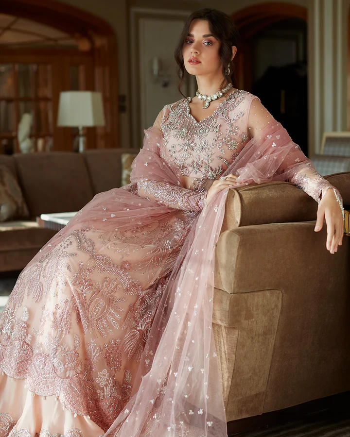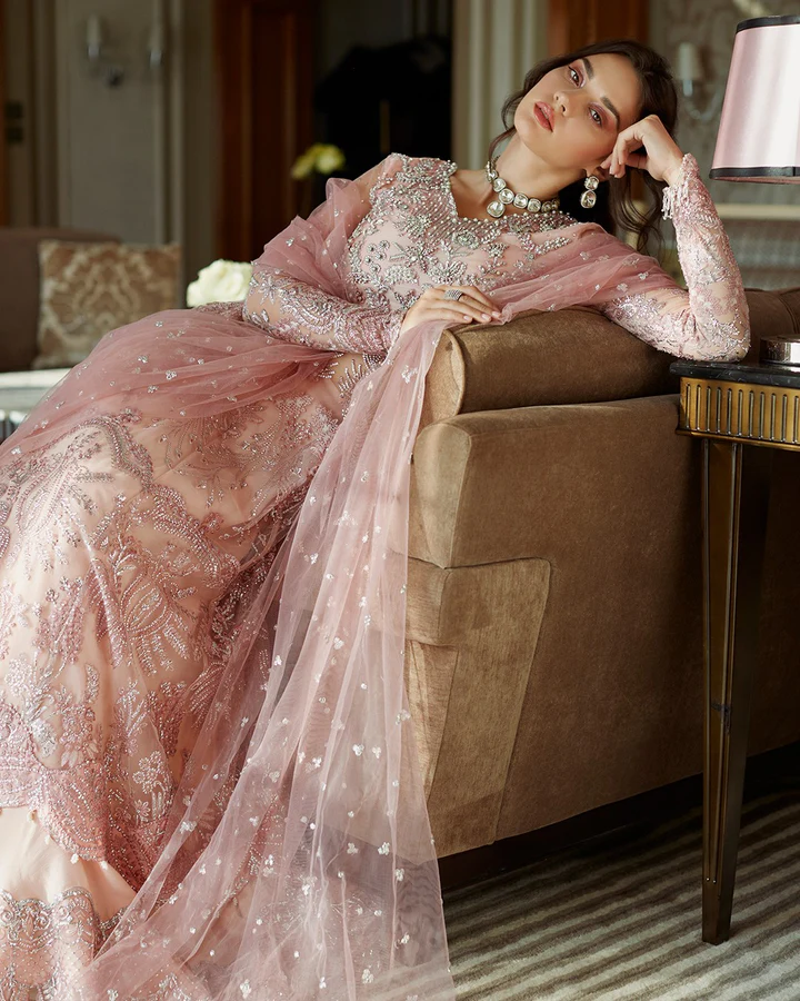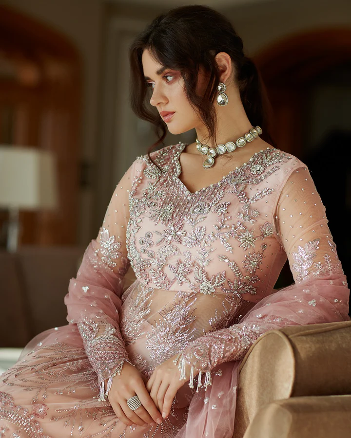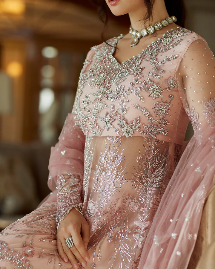 To complete the breathtaking look, the ensemble includes a delicate net dupatta in matching pink. Fully adorned with sequins, mukaish, and silverwork, the dupatta adds the perfect shimmering touch. Its refined detailing complements the frock and sharara effortlessly, making it a flawless match for your wedding attire.