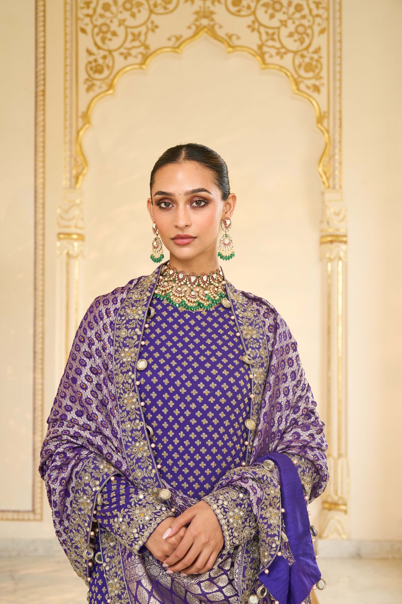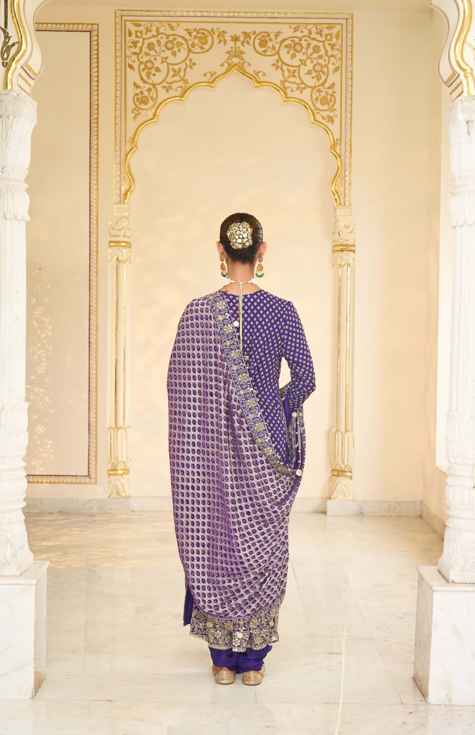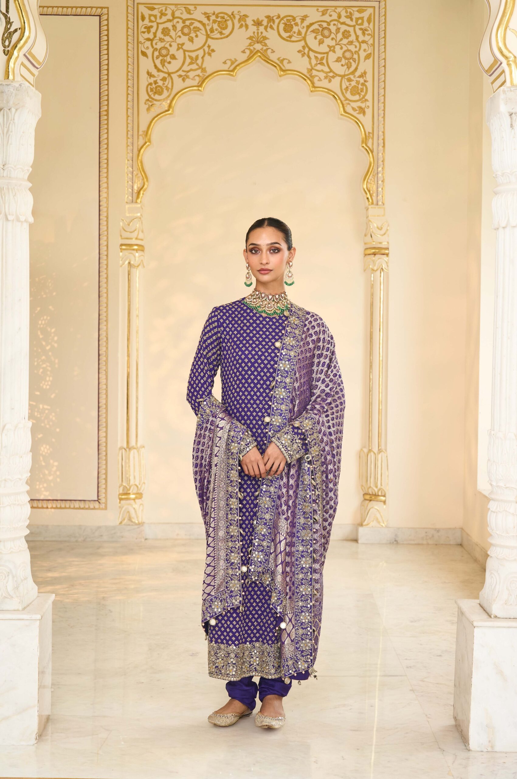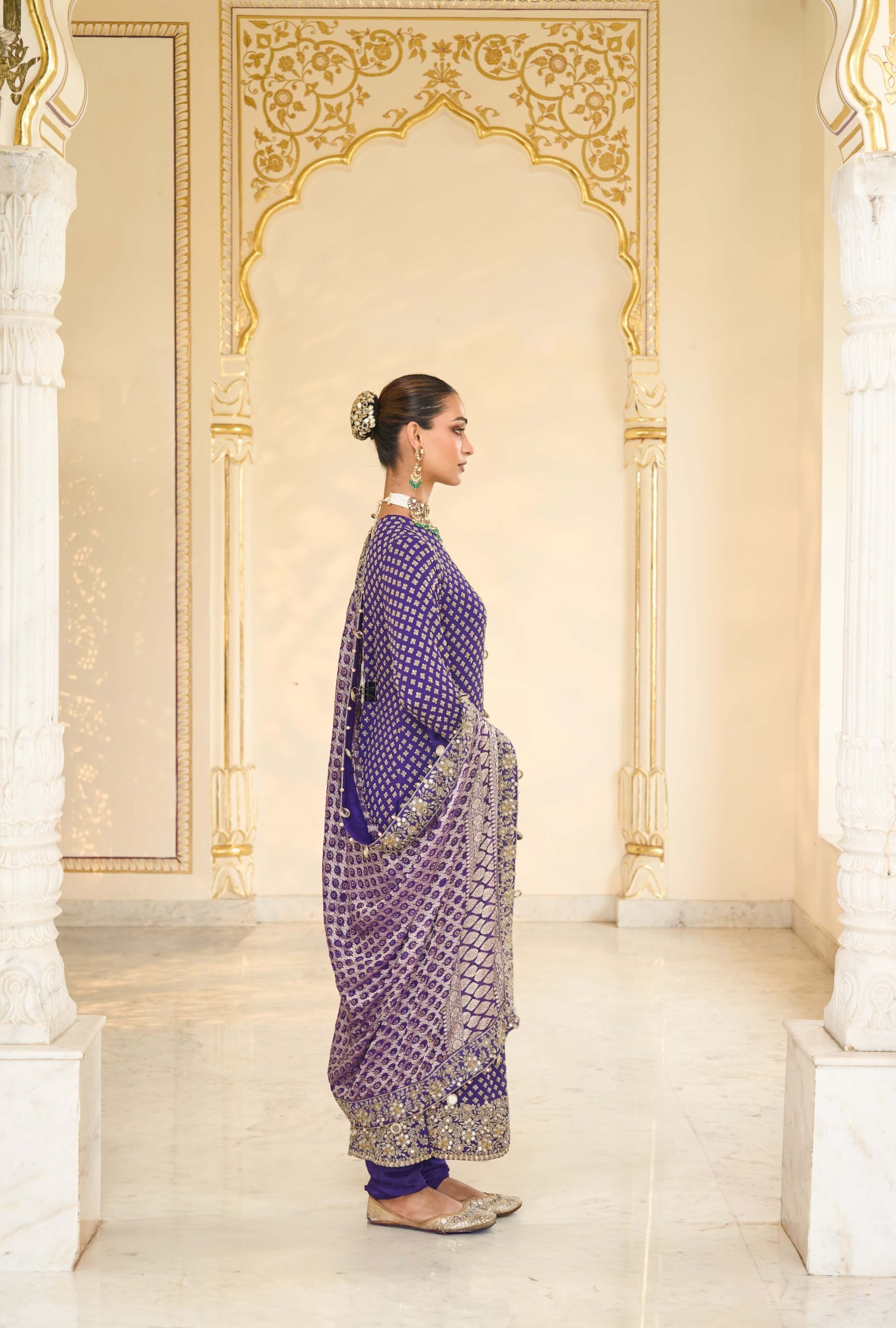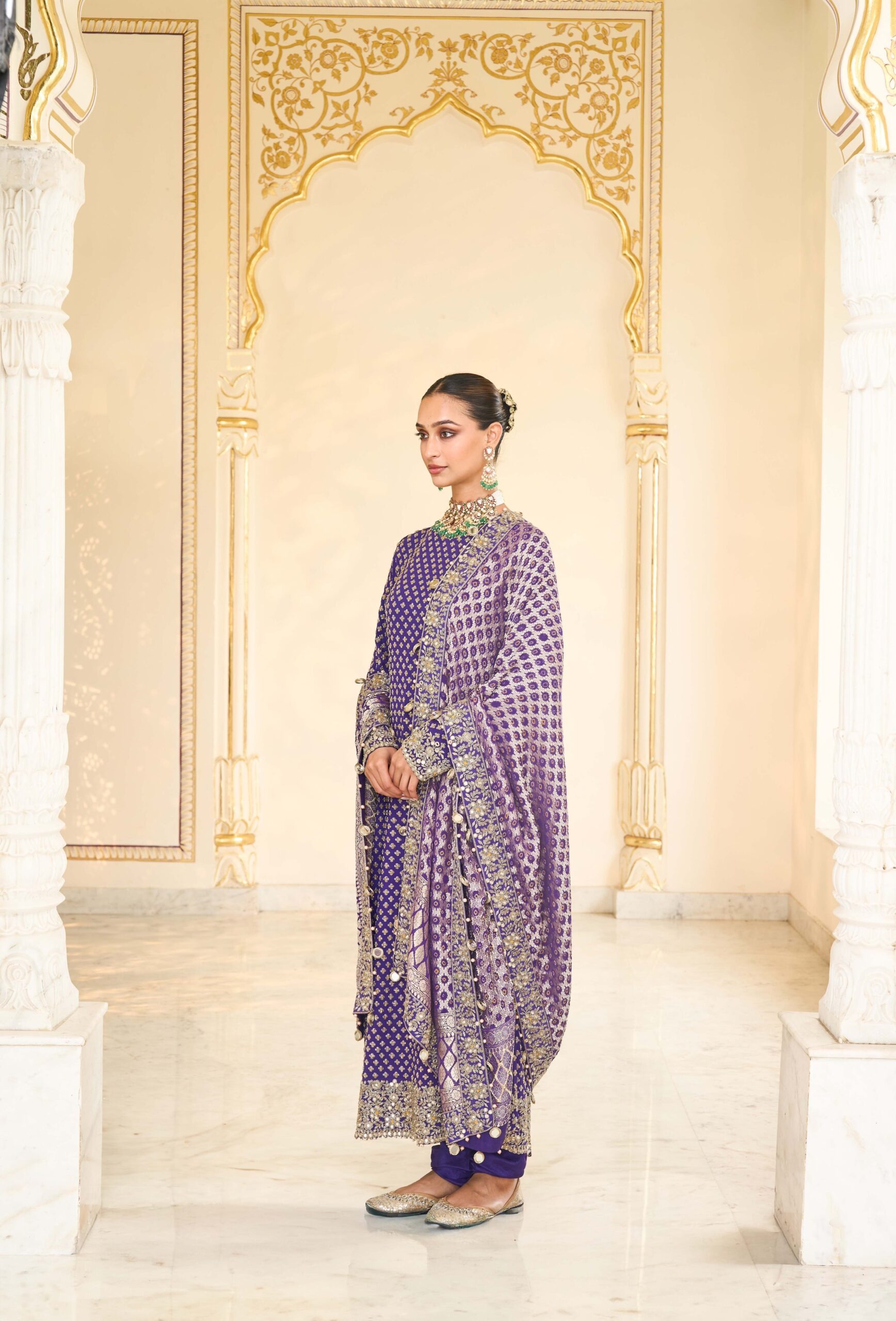 A timeless purple long-kurta and churidar set enriched with intricate craftsmanship and paired with a beautifully finished bandhani dupatta for an elegant ceremonial look.