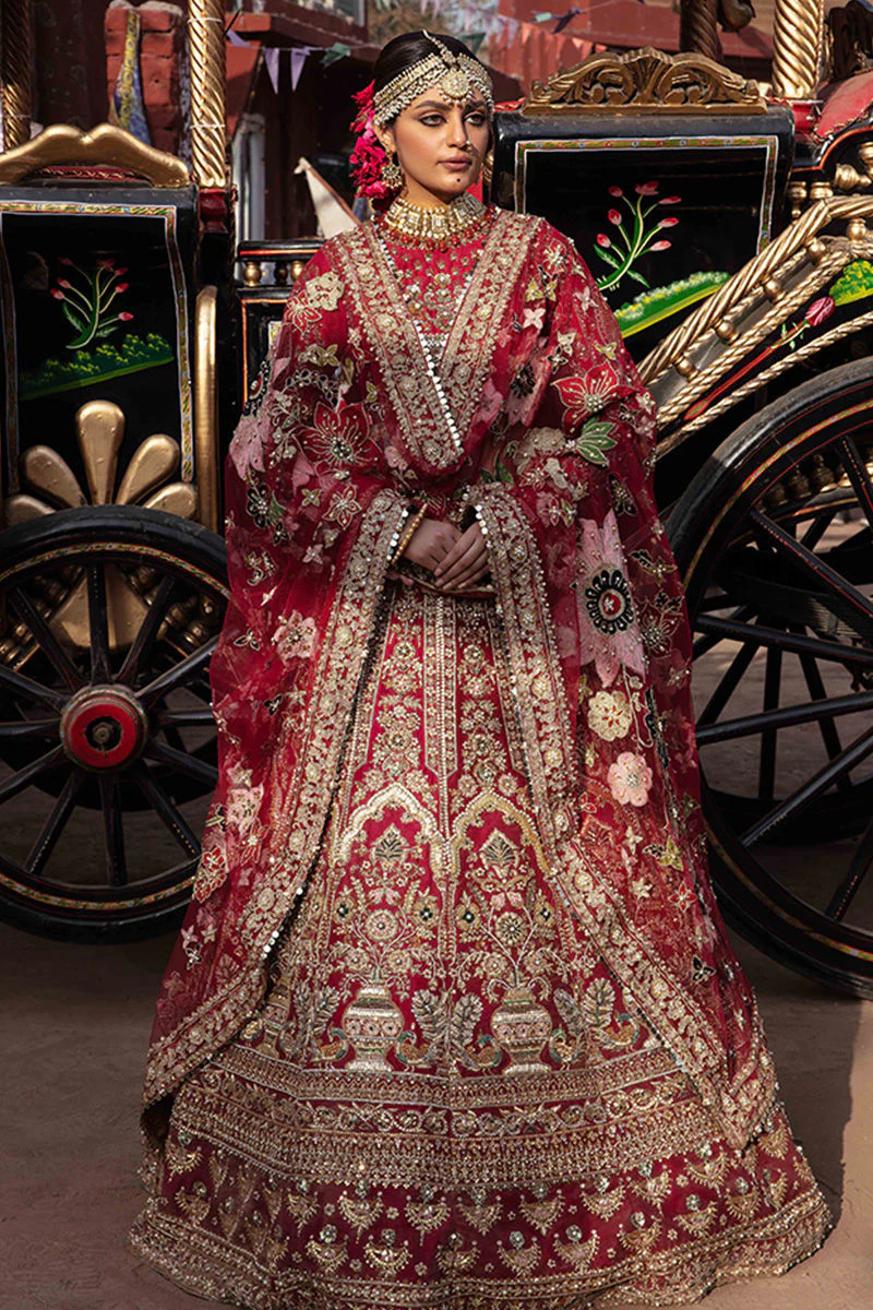 The ensemble is completed with a matching ruby red net dupatta, beautifully worked with multicolored aari, zardozi, pearls, sequins, and crystals. Finished with delicate tilla and pearl edging, the dupatta adds depth and elegance to the bridal look. A coordinated red net veil further enhances the ensemble, delicately sprayed with pearls and embellished with sequins, pearls, and fine pipes, and finished with a refined scalloped edging for a majestic finish.