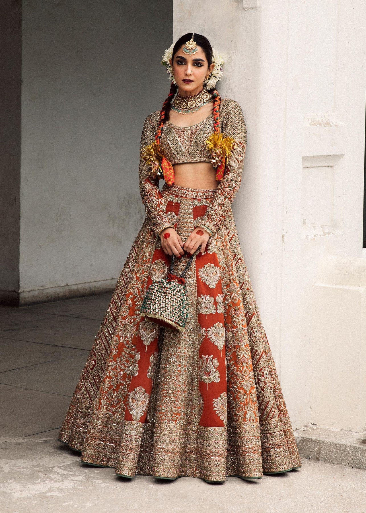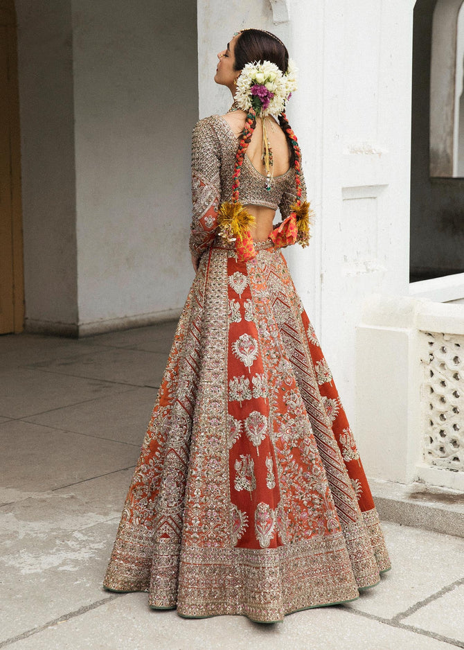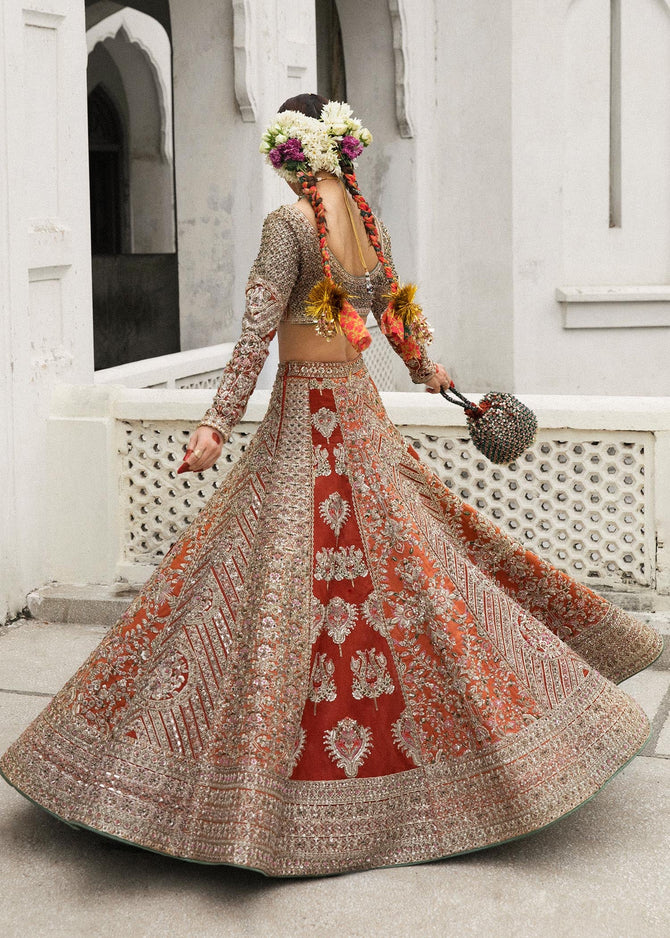 The lehenga is made from luxurious satin silk in a matching rust tone, expertly tailored with a voluminous flare to enhance the bridal silhouette. The skirt is enriched with handcrafted embroidery and heavy embellishments, harmonizing beautifully with the choli. Fully lined for comfort, the lehenga combines opulence with flawless fit, making it an unforgettable choice for the wedding day.