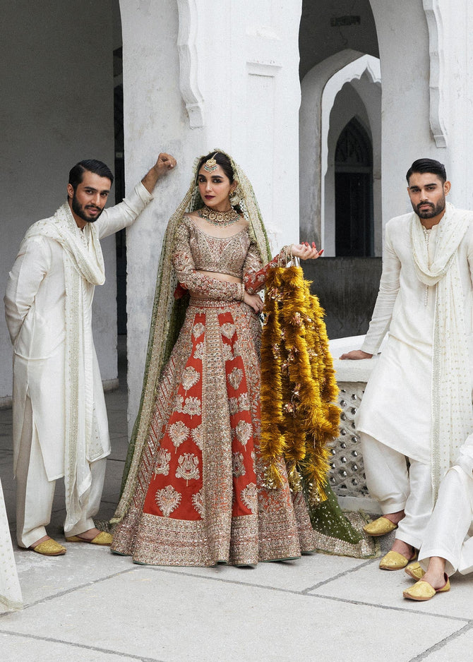 This ensemble includes two exquisite dupattas for a versatile and grand bridal look. The first is a rust-colored organza dupatta, featuring heavily embellished borders on all sides, enhancing the couture feel of the outfit. The second is a contrasting green net dupatta, adorned with detailed finishing, embroidery, and subtle embellishments, adding vibrance and elegance to the ensemble.