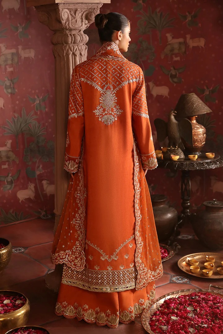 The kameez is designed in an alluring orange shade and crafted from premium raw silk that offers a rich texture and elegant fall. Intricate embroidery is arranged across the surface, enhanced with refined detailing that adds depth and sophistication. Embellished borders and sleeves complete the look with a regal and polished finish.