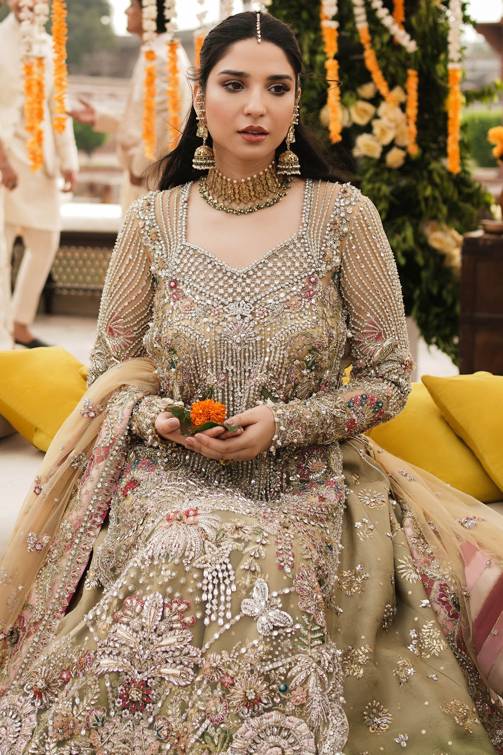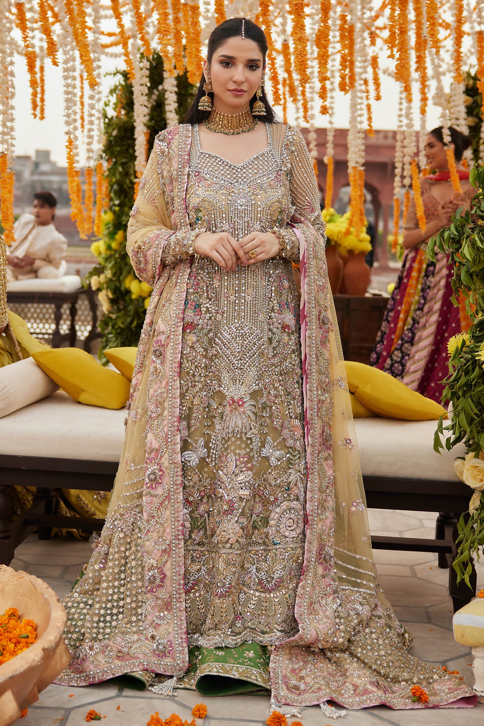 A coordinated dupatta may be styled to complement the ensemble, enhancing its ethereal charm while maintaining visual harmony with the intricate detailing.