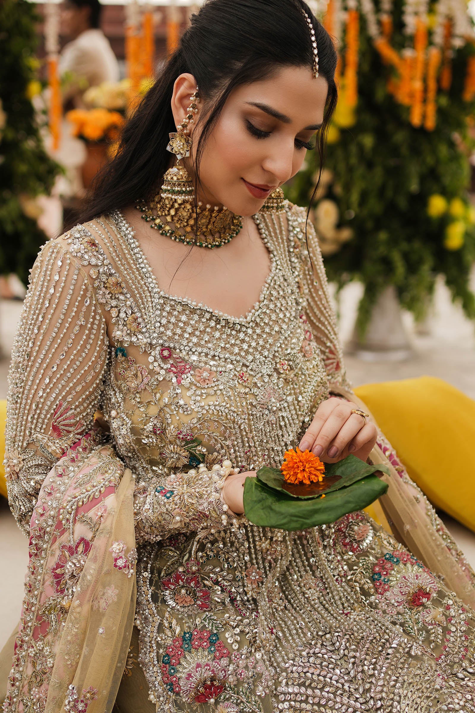 Expertly handcrafted using pearls, zardozi, gemstones, and fine metallic tinsels. Minor variations may occur, celebrating the authenticity of artisanal craftsmanship.