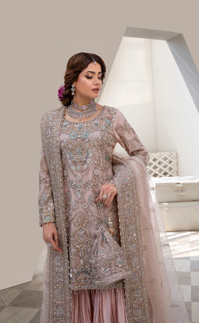The shirt is made from organza, the gharara from Sheesh Silk, and the dupatta from organza, creating a luxurious blend of textures for both comfort and style.