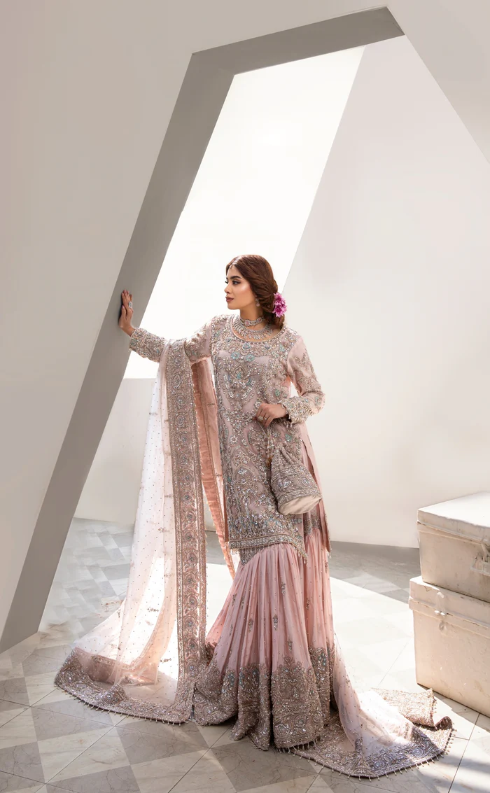 A stunning Salmon Pink ensemble featuring a hand-embroidered organza shirt, luxurious Sheesh Silk gharara, and matching organza dupatta, combining traditional craftsmanship with modern elegance for weddings and special occasions.