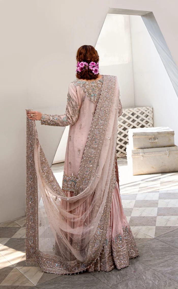 The ensemble features fully handcrafted embroidery, including threadwork, dabka, kora, and sequins. Slight artisanal variations ensure the authenticity and uniqueness of each piece.