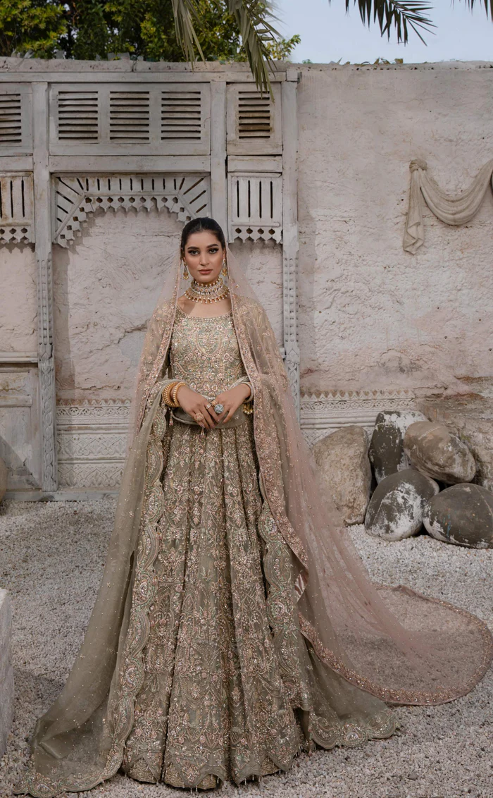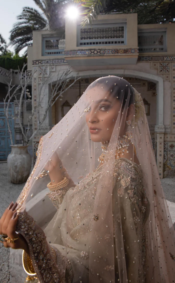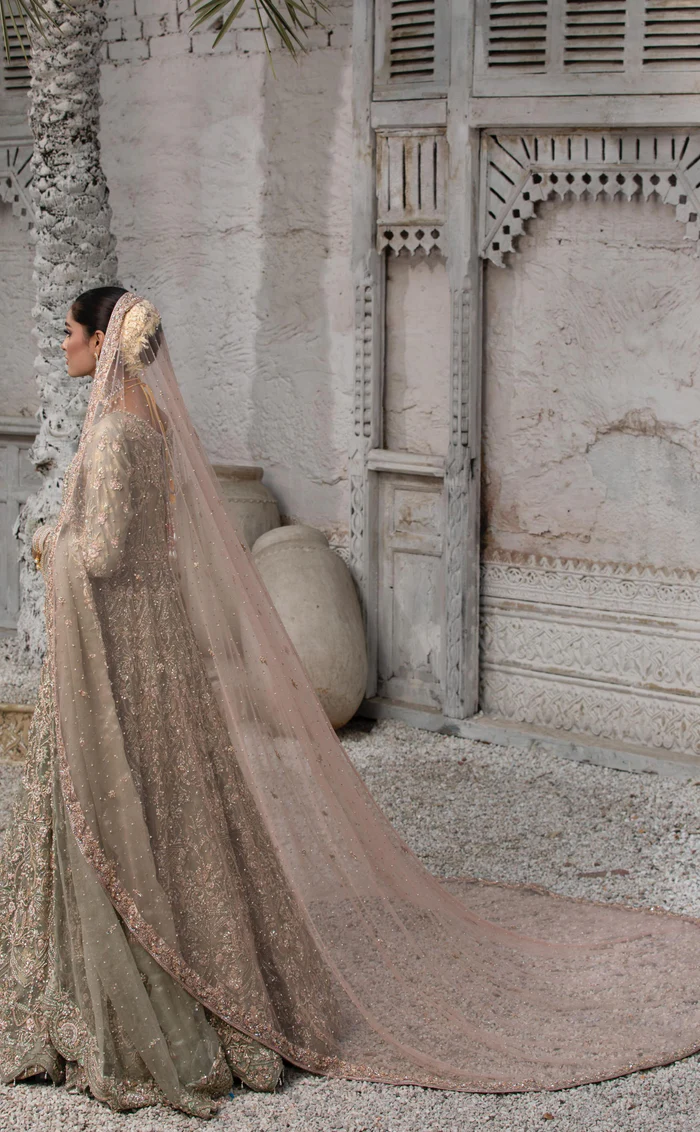 Crafted from luxurious sea green organza, the long dress features an elongated coat-style silhouette that drapes gracefully. The front and back are adorned with meticulous hand embroidery, incorporating Cora, Dabka, Sitara, Pearls, Sequins, and Stone Crystals. The soft lining ensures comfort while maintaining the structured flow. The heavy flare adds drama and elegance, making every step a statement of grace.