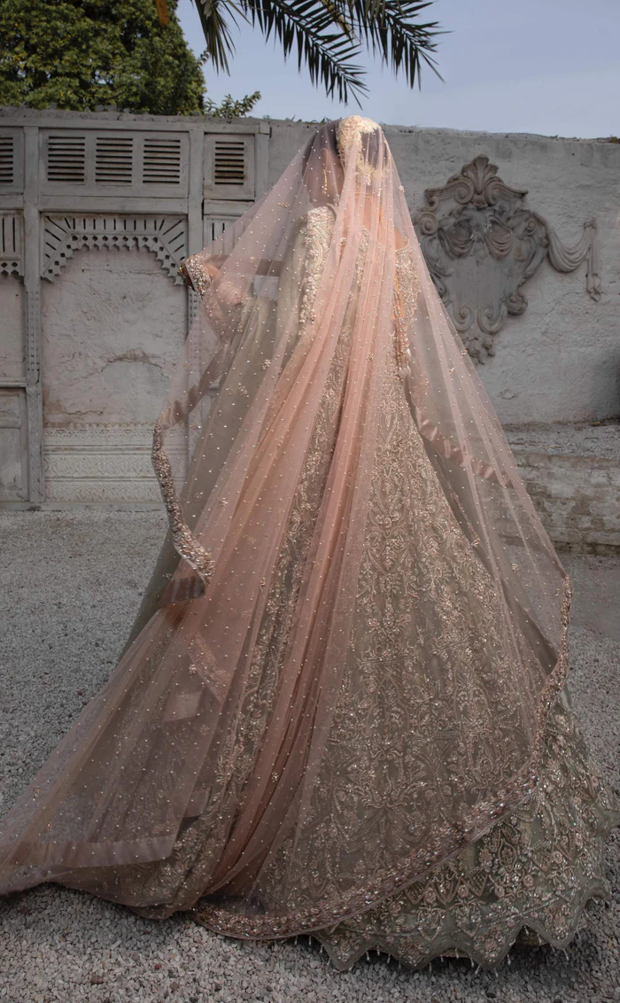 A matching sea green organza dupatta richly decorated with hand-embroidered motifs and a heavy stone shower border on all four sides, adding a regal touch. A peach-colored net dupatta embroidered with delicate stones and motifs, finished with a four-sided border, provides contrast and complements the overall ensemble with sophistication and charm.