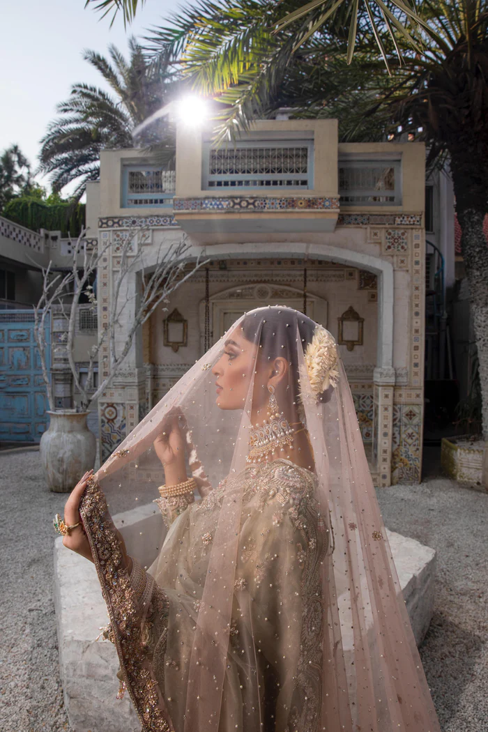 Sea green organza for the dress and main dupatta, peach-colored net for the trail dupatta, Jamawar for the lehenga, with soft inner lining for comfort.