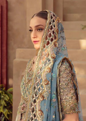 The ensemble is paired with a matching seafoam sheer dupatta, bordered with a heavily detailed scalloped golden border. The veil is adorned with shimmering sequins and delicate floral motif placements that mirror the intricate work of the pishwas. Its edges are meticulously finished with a structured lining, providing the perfect weight for a regal drape.