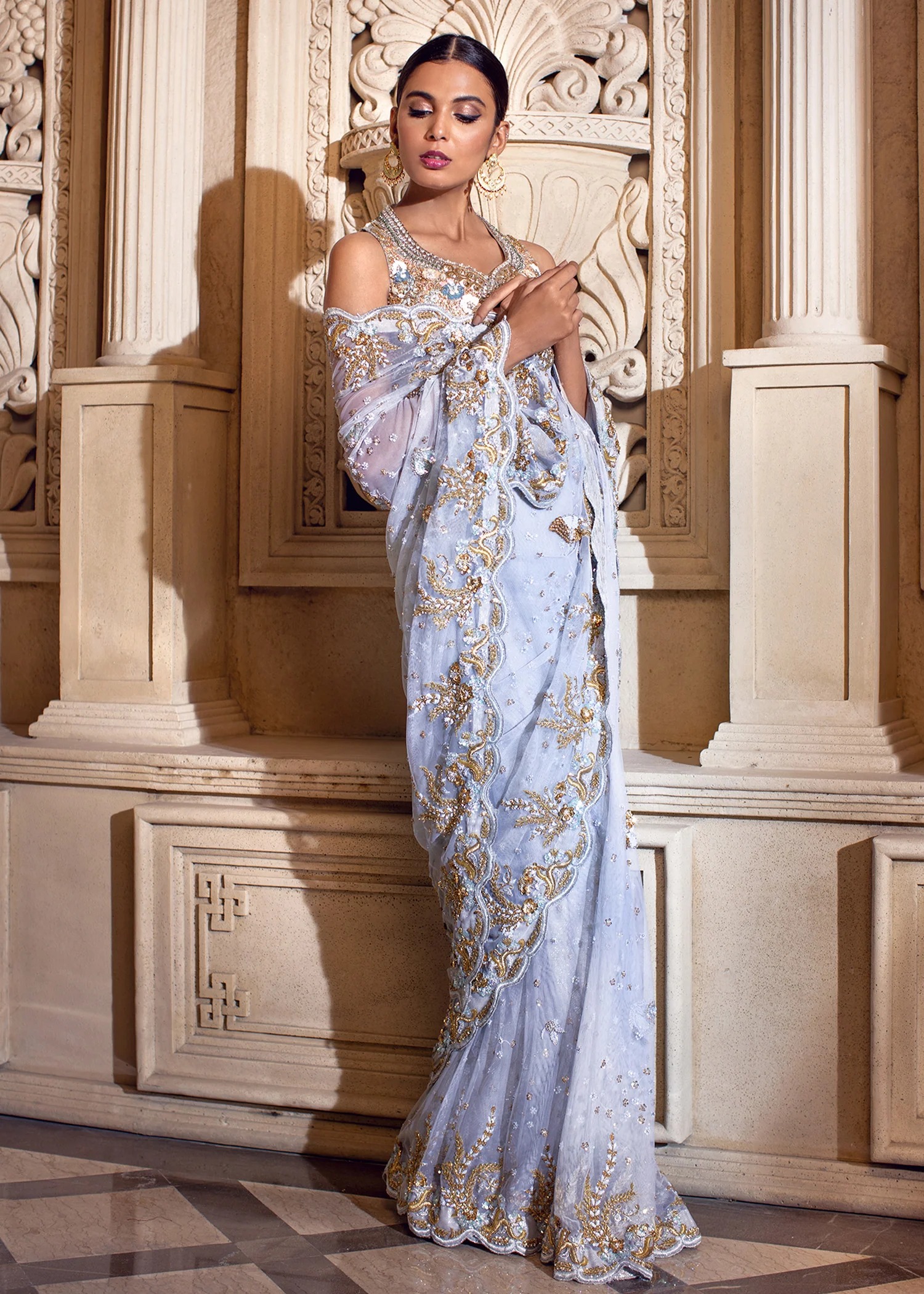 A breathtaking powder blue ensemble featuring an intricately worked cold-shoulder blouse and a sheer net saree adorned with regal gold embroidery and scalloped edges.