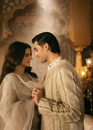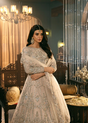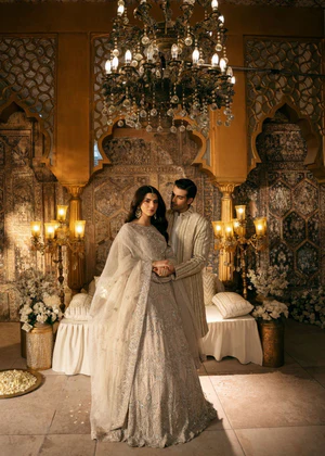 A refined palette of silver and champagne gold, complemented by a soft light pink dupatta.