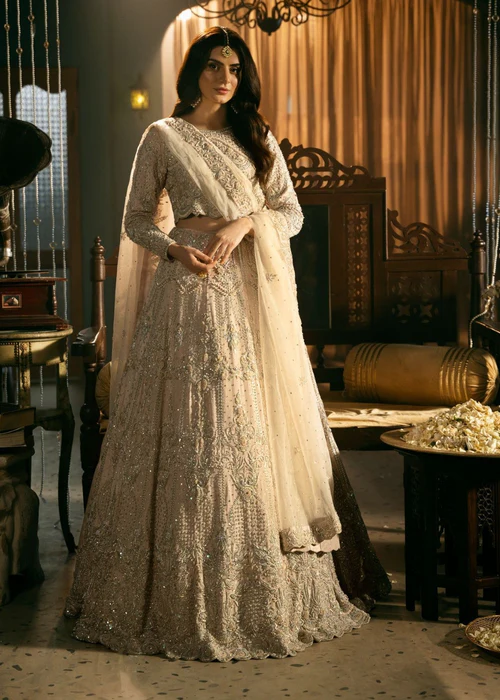 The choli is intricately detailed to mirror the elegance of the lehnga, featuring refined embroidery accented with shimmering silver and champagne gold tones. Floral motifs are delicately highlighted with crystal and beadwork, creating a graceful sparkle across the surface. The full-length sleeves are richly embellished with stonework and beaded crystals, adding a sophisticated shimmer that enhances the overall opulence while maintaining a balanced, elegant silhouette.