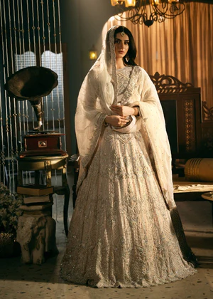An exquisitely crafted lehnga and choli set adorned with silver and champagne gold embellishments, finished with a soft light pink dupatta for an ethereal, luminous bridal look.