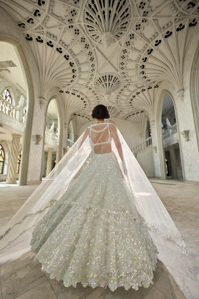 Instead of a traditional veil, this ensemble is complemented by a majestic, floor-length sheer cape crafted from premium silver net. The cape features a delicate “chhatta” of shimmering sequins and is bordered with hand-embroidered floral lace that harmonizes with the intricate work on the lehenga. Its lightweight transparency adds an ethereal, regal quality to the look, allowing the detailed bustier and lehenga to remain the shimmering centerpiece of the ensemble.