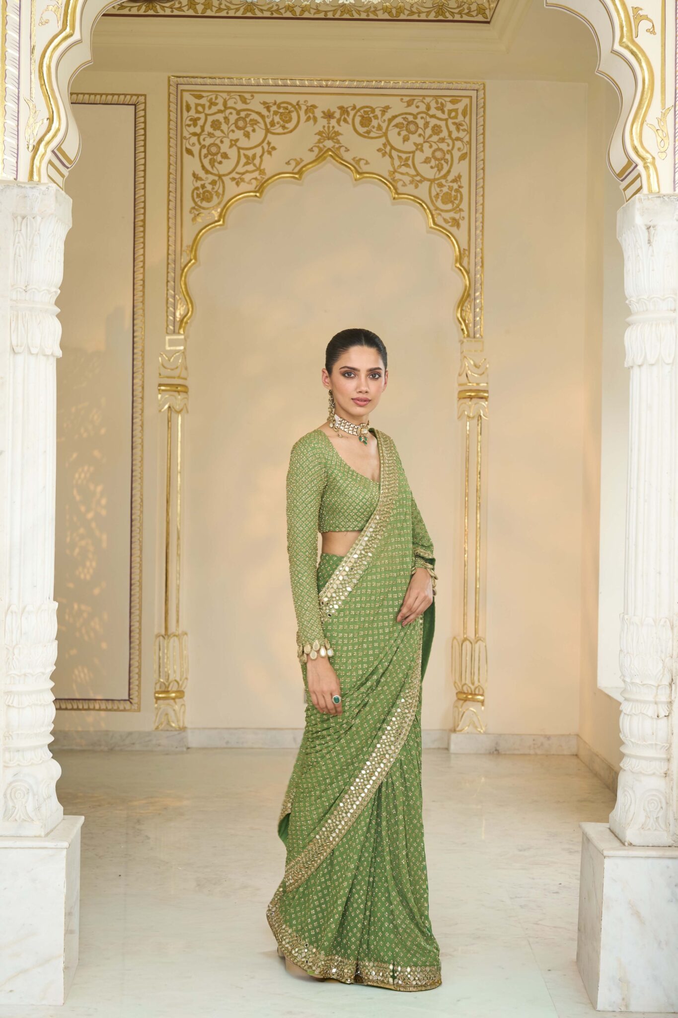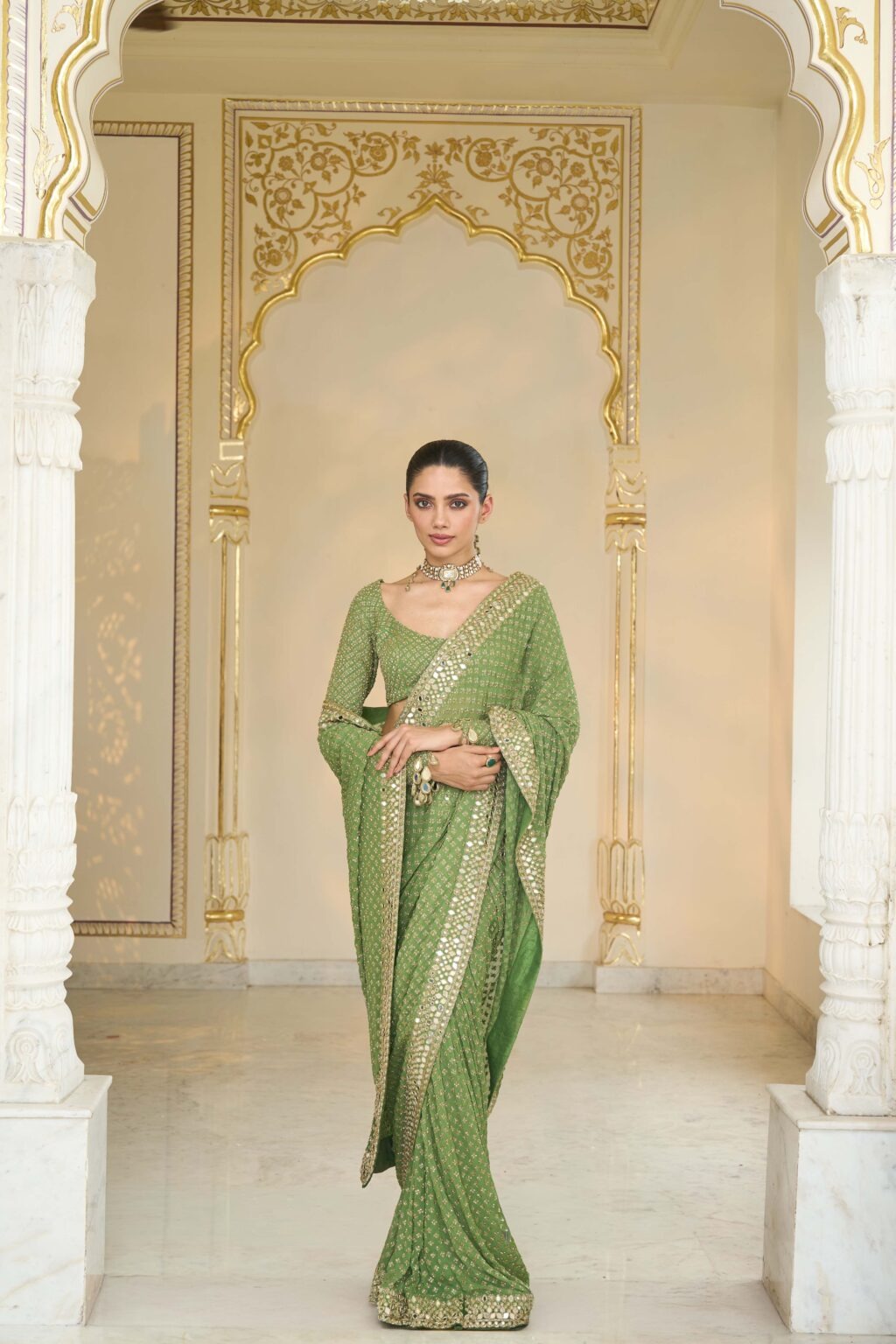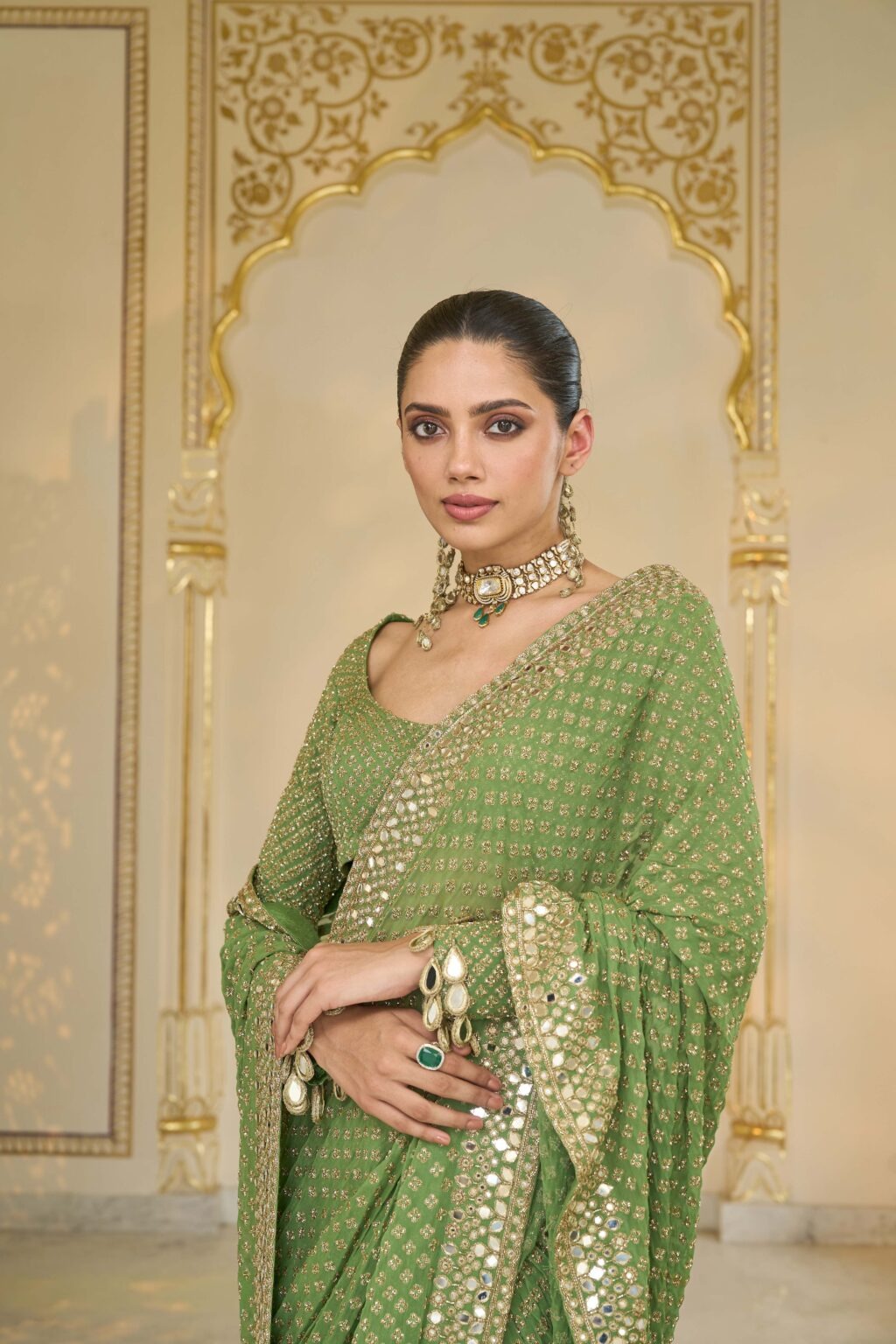 The sari is crafted in a warm olive base with beige gold accents, made from premium fabric that drapes gracefully. Intricate hand-embroidered mirrors and cutdana motifs create a dazzling star-like effect across the fabric, adding depth and refined charm to the ensemble.